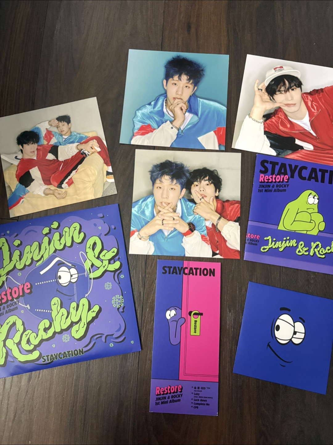 Selling Jinjin & Rocky's STAYCATION 1st Mini Album! It's in great condition. Perfect for any Astro fan looking to add to their collection