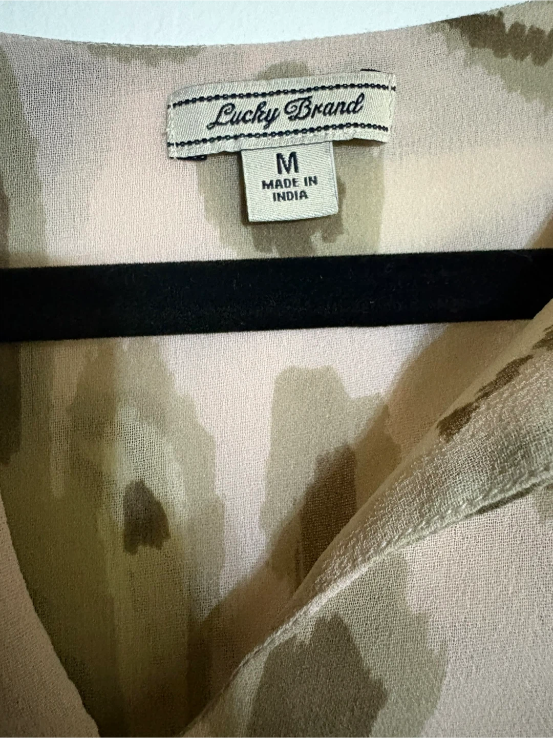 Lucky Brand women's sheer blouse with a paisley print. It's size medium and made of 100% polyester. The fabric is lightweight and flowy. This top is great for layering or wearing on its own!