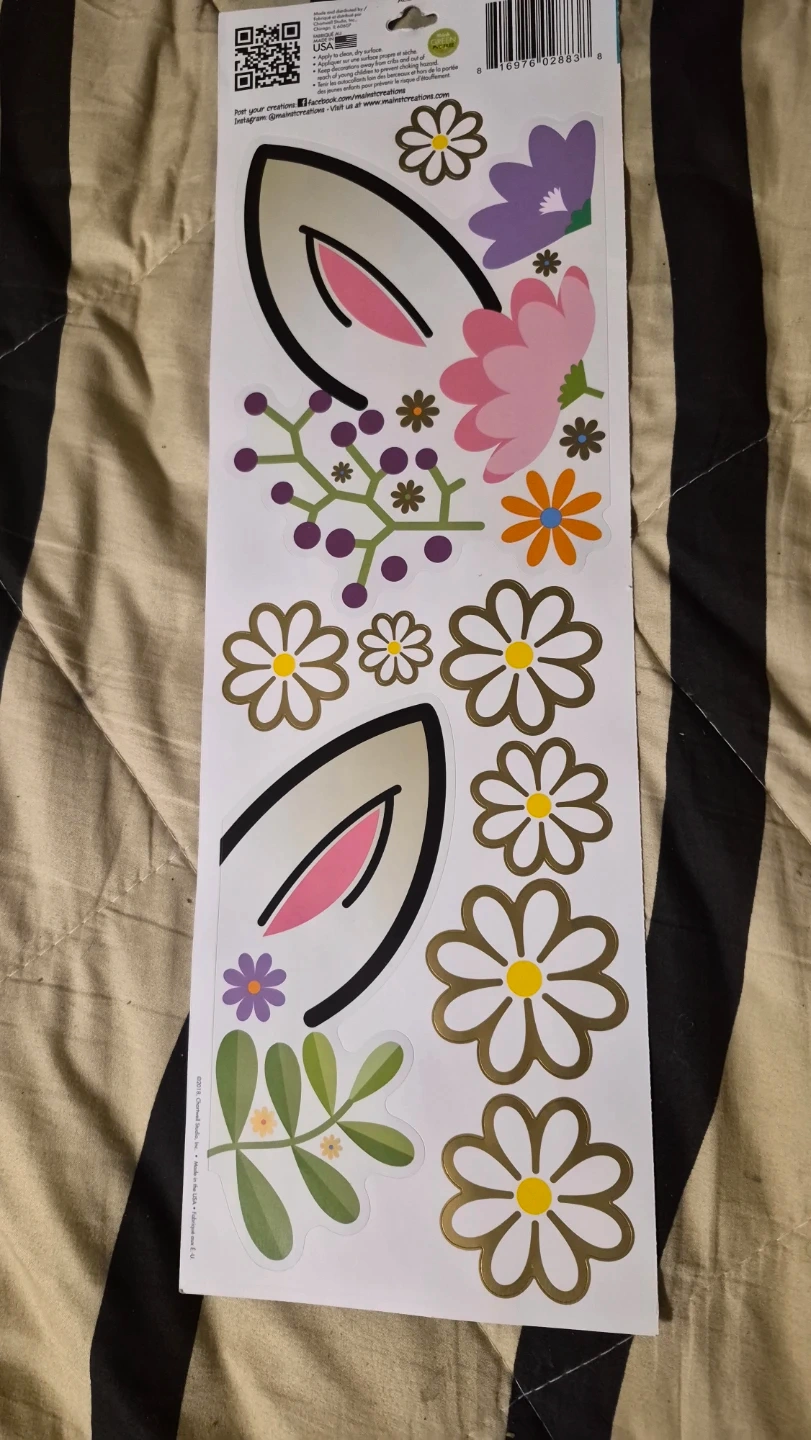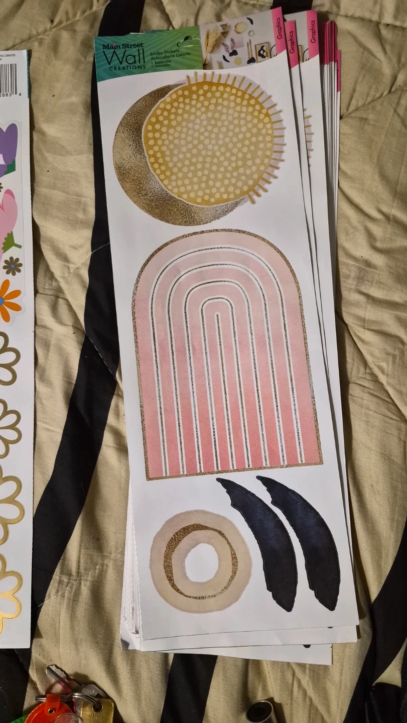 A collection of jumbo wall stickers featuring various designs, including floral elements, celestial bodies, and a unicorn theme. These are peel-and-stick decals, suitable for adding decorative touches to walls. Some sheets also include text-based designs like 'Wash Dry Fold Repeat'.