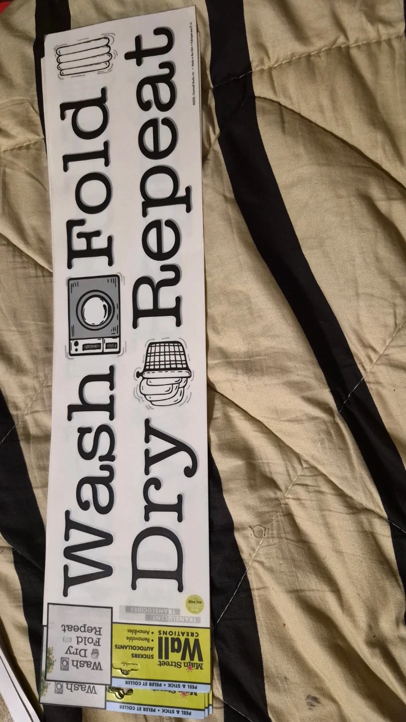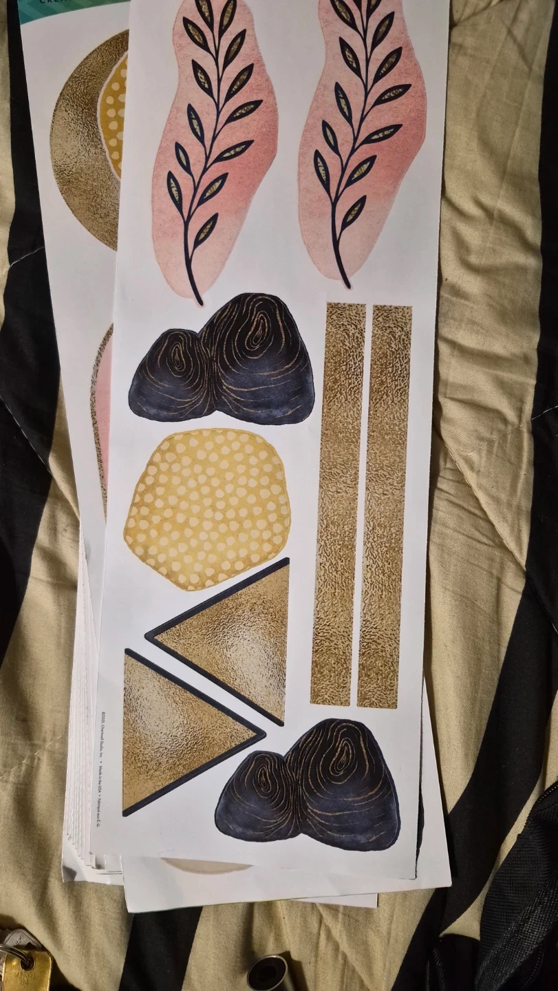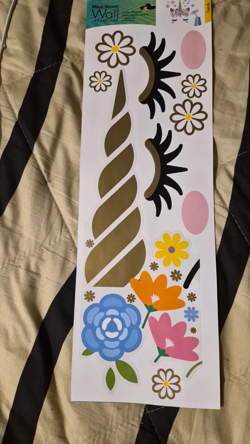 A collection of jumbo wall stickers featuring various designs, including floral elements, celestial bodies, and a unicorn theme. These are peel-and-stick decals, suitable for adding decorative touches to walls. Some sheets also include text-based designs like 'Wash Dry Fold Repeat'.