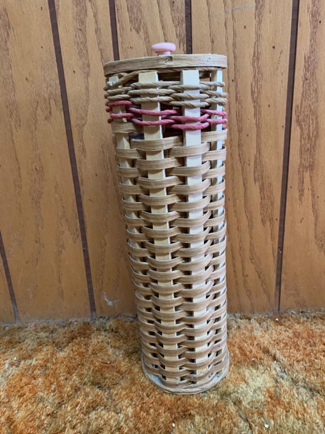 This is a woven basket with a light pink lid. It's made of natural wood-toned fibres and has decorative pink cord accents. Perfect for small storage needs around the house!