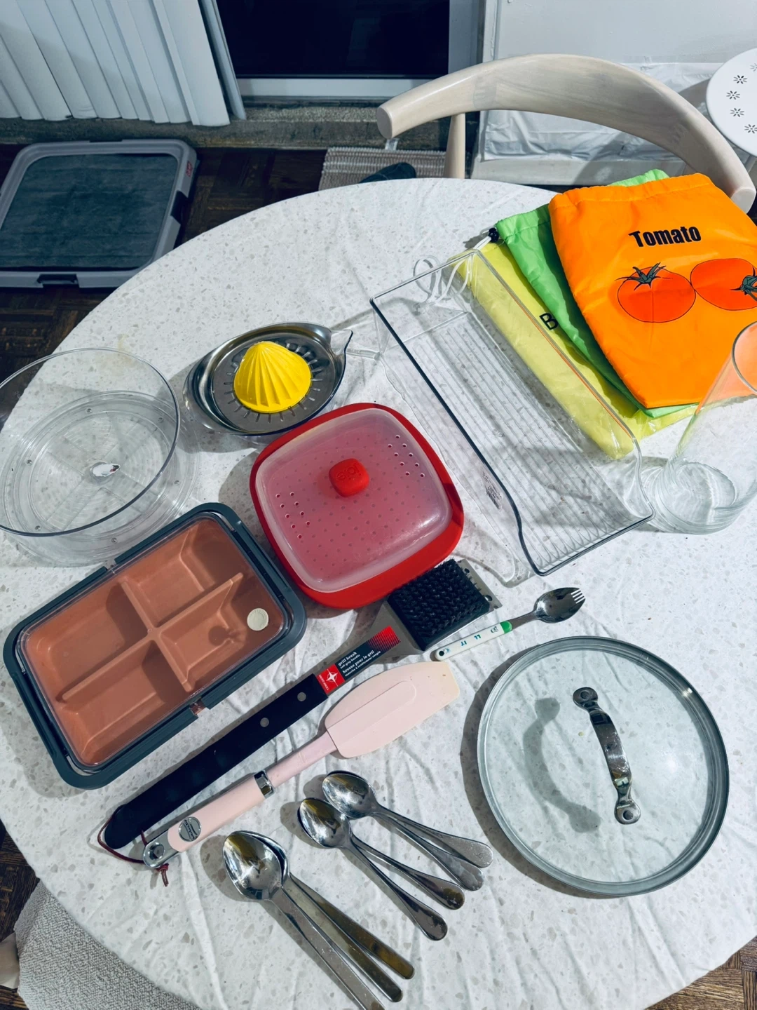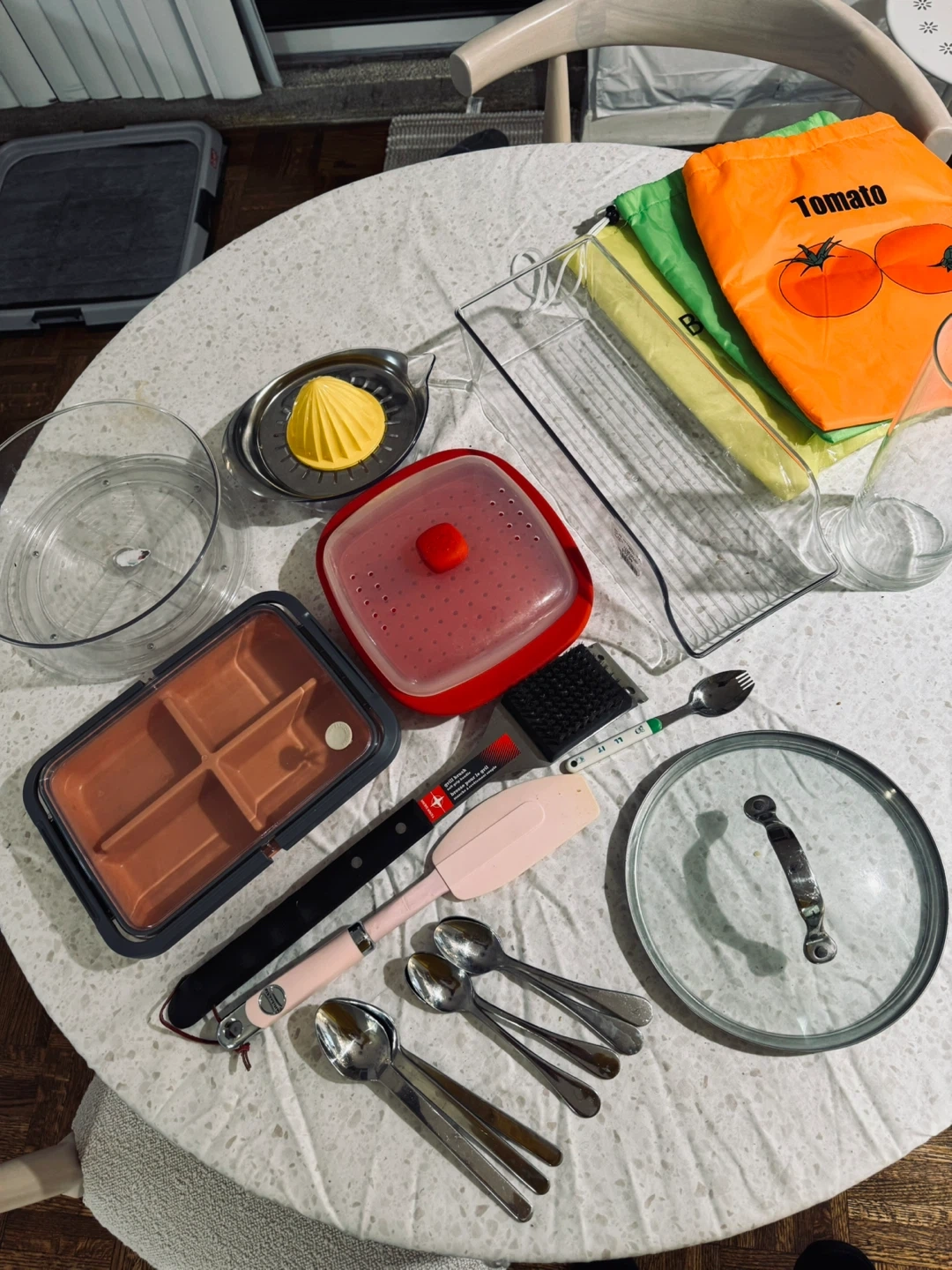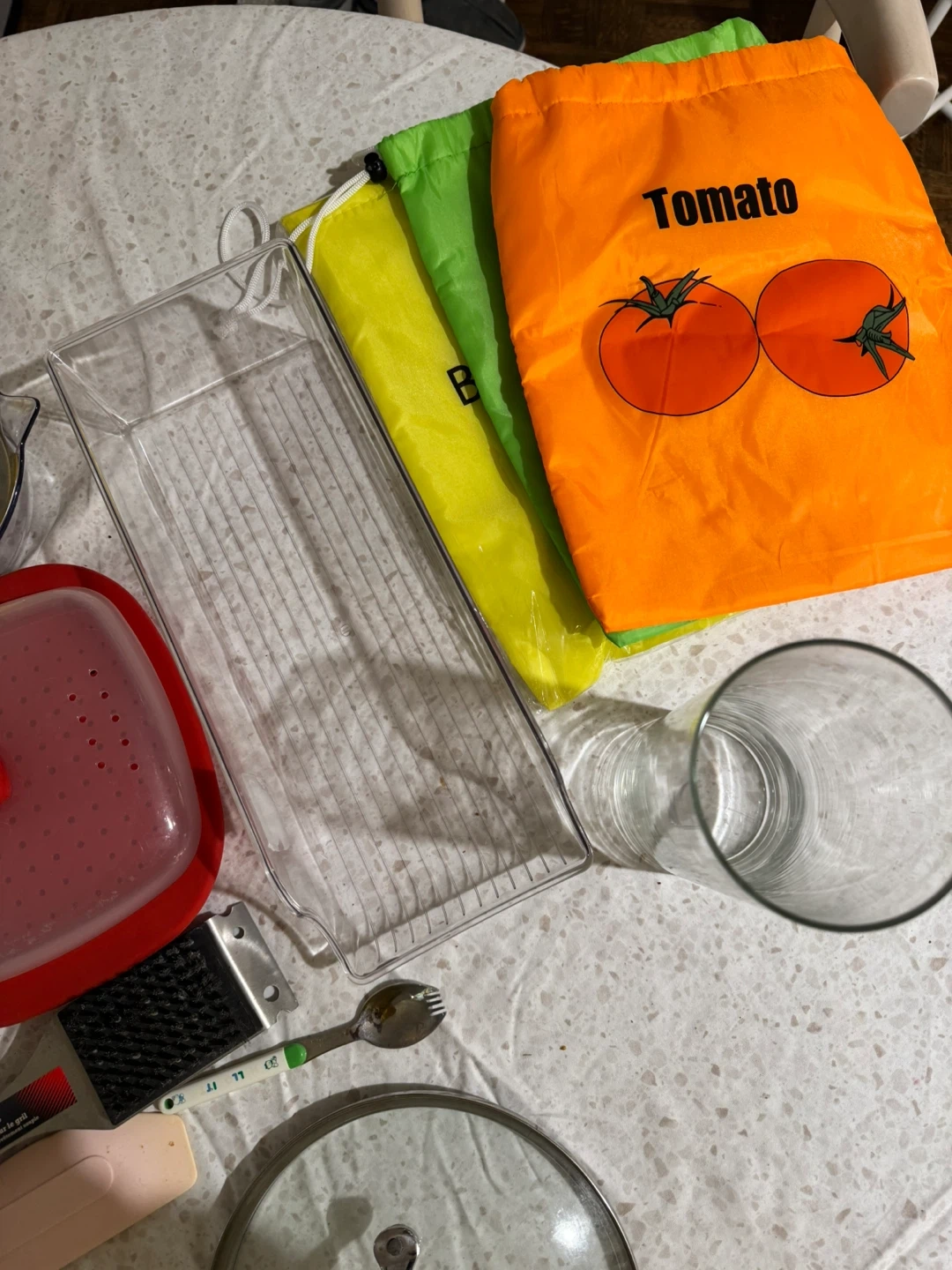 Assorted kitchen tools including a citrus juicer, a silicone steamer lid, a multi-compartment ice cube tray, a grill brush, a spatula, spoons, and reusable produce bags. Includes a glass, a pot lid, and a clear organizer tray. Great for various kitchen tasks!
