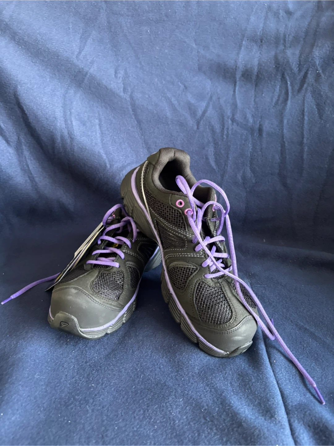 Brand new. These black steel toe shoes feature purple laces and accents. They're made with breathable mesh uppers and a supportive sole steel toe size 8
