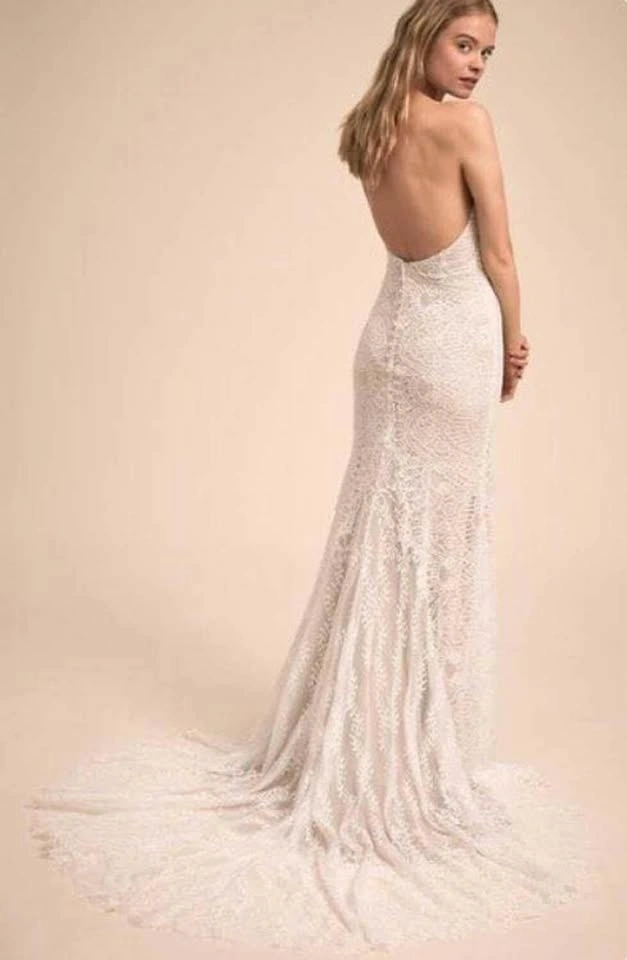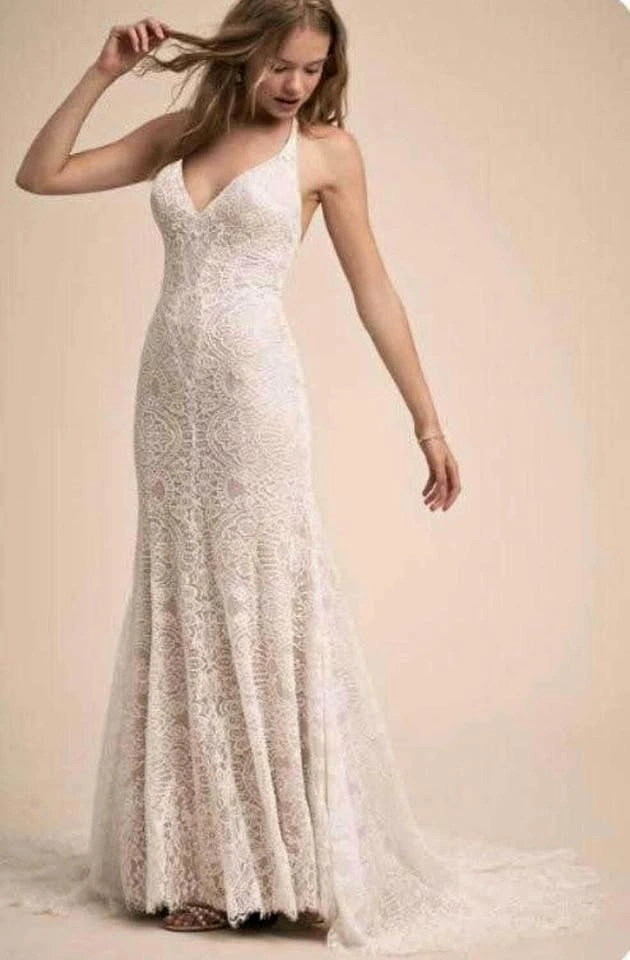 Eddy K for BHLDN (Anthropologie) Reno Dress, Spring 2018 Collection. Size 8US (fits 4-8 with stretch). Bust 34, Waist 28, Hips 38. Halter style with open back. Ivory colour. Features illusion buttons over the zipper. Minor alterations to the halter and a hidden train loop added to the lace (Alterations by Lily Kennedy). Dry cleaned. Open to offers.