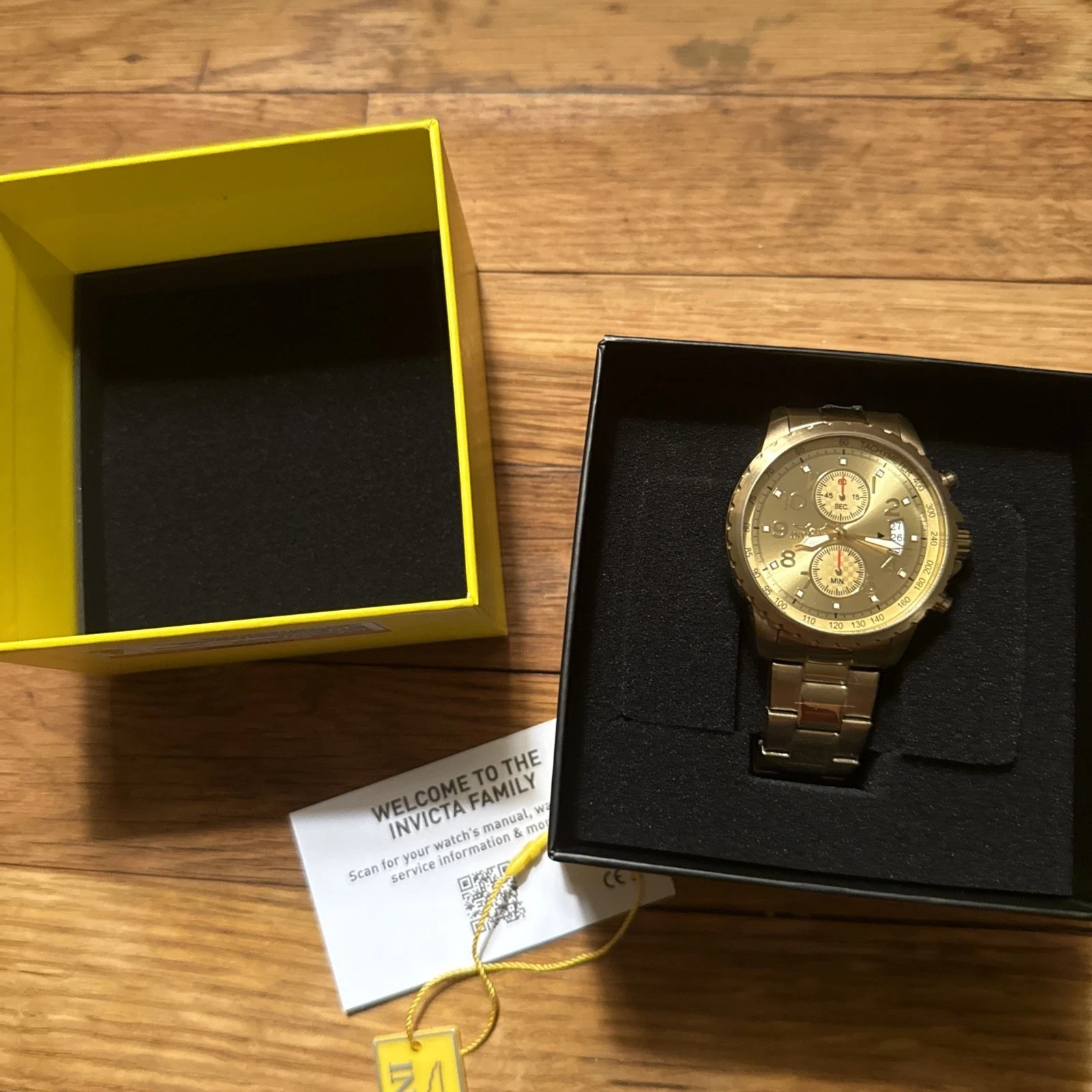 Invicta Specialty watch, model 48897. Features a stainless steel case and band, golden dial, and quartz analog movement. Water-resistant up to 30 meters. Case size is 45mm. Feel free to message if you have any questions!