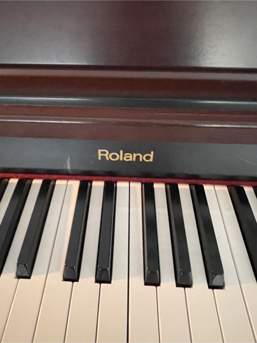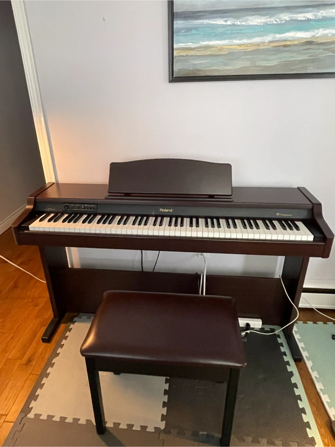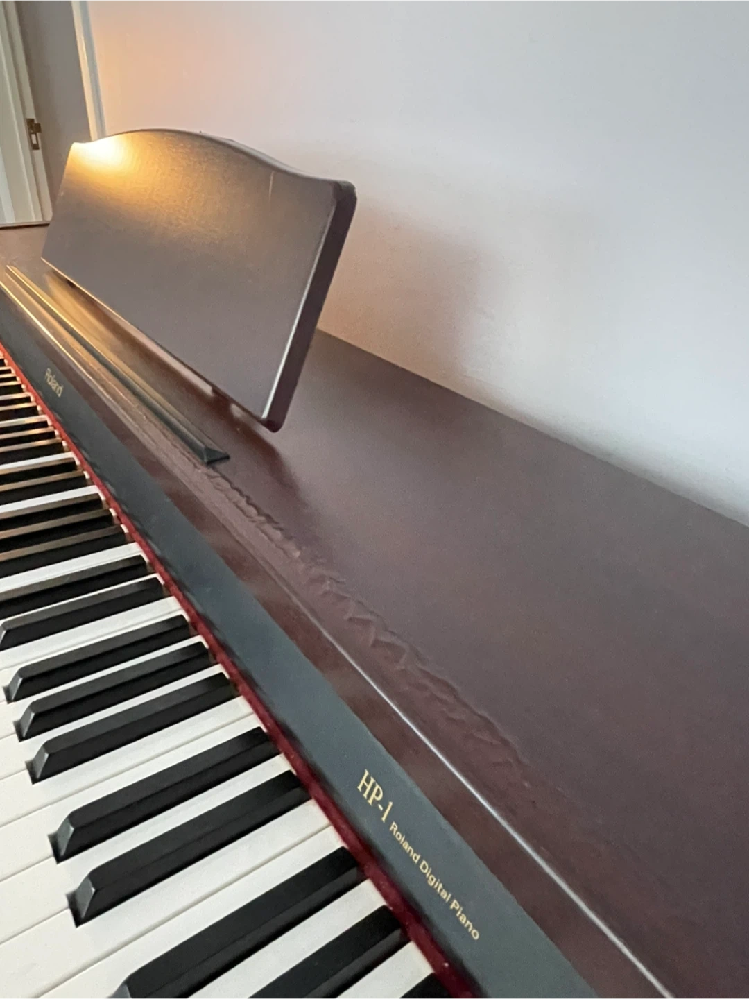 Roland HP-1 digital piano with 88 weighted keys. It has a dark wood finish and includes a music stand and bench. Touch sensitivity settings include Light, Medium, and Heavy.