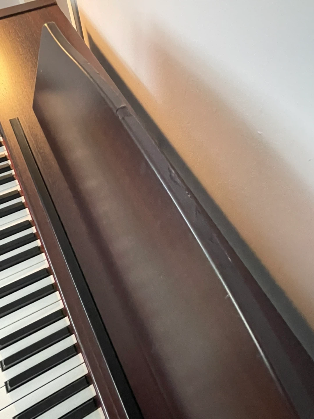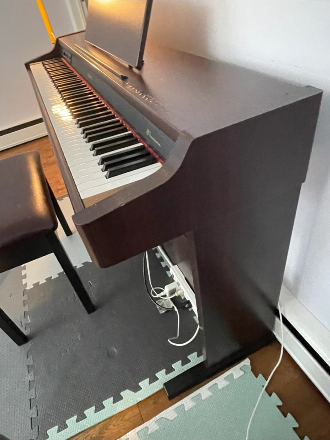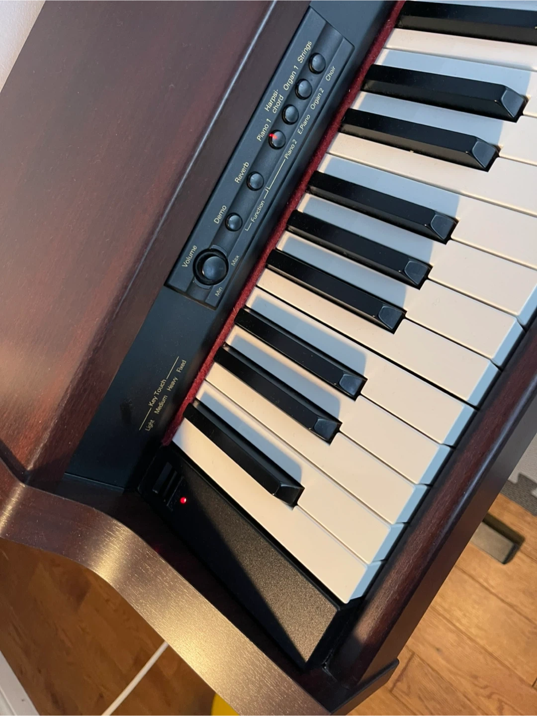Roland HP-1 digital piano with 88 weighted keys. It has a dark wood finish and includes a music stand and bench. Touch sensitivity settings include Light, Medium, and Heavy.