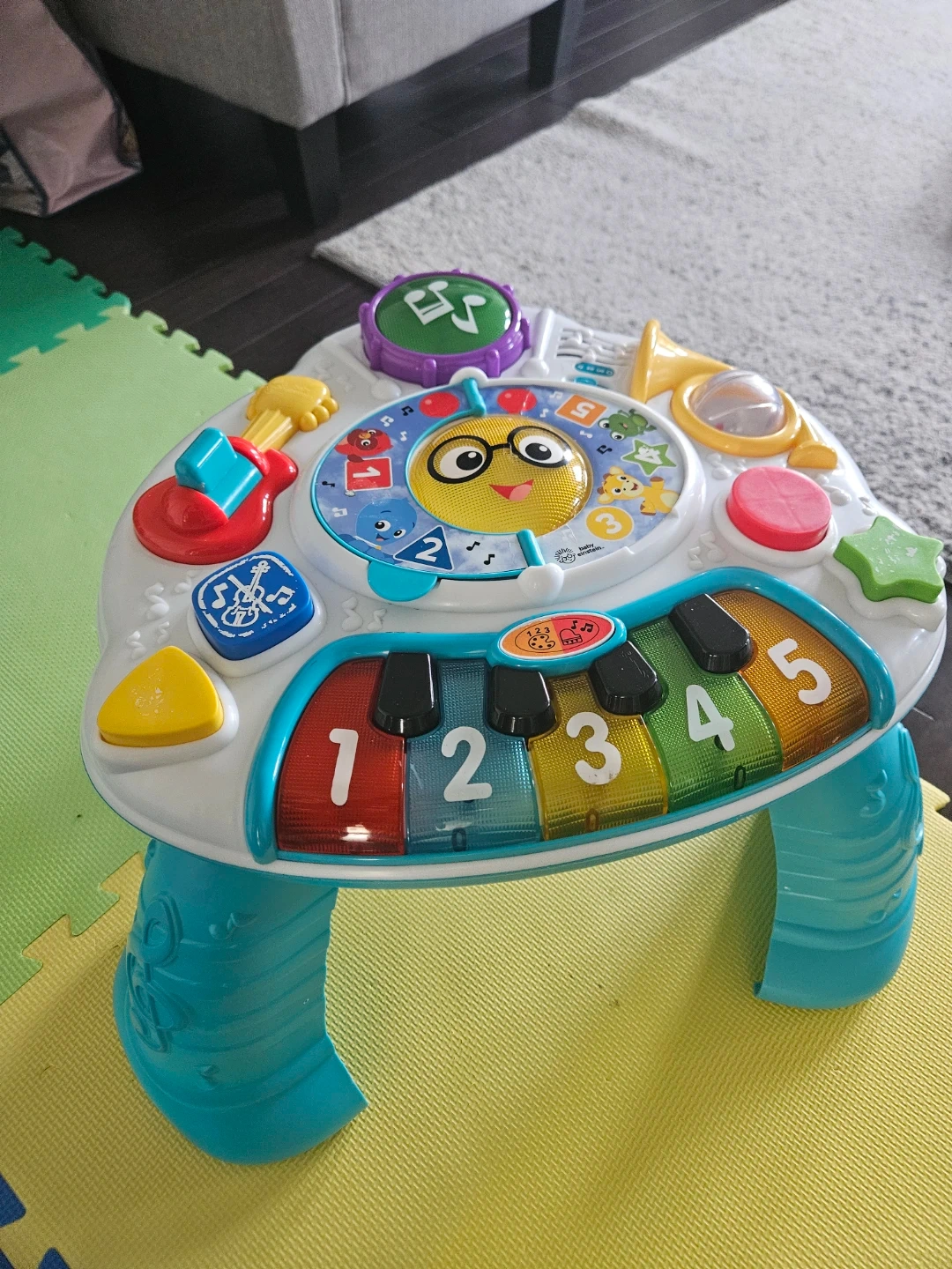This Baby Einstein musical activity table has a piano with numbers 1-5, a drum, and a horn. It also features a red button and guitar buttons. Made for little ones to explore sounds and music!