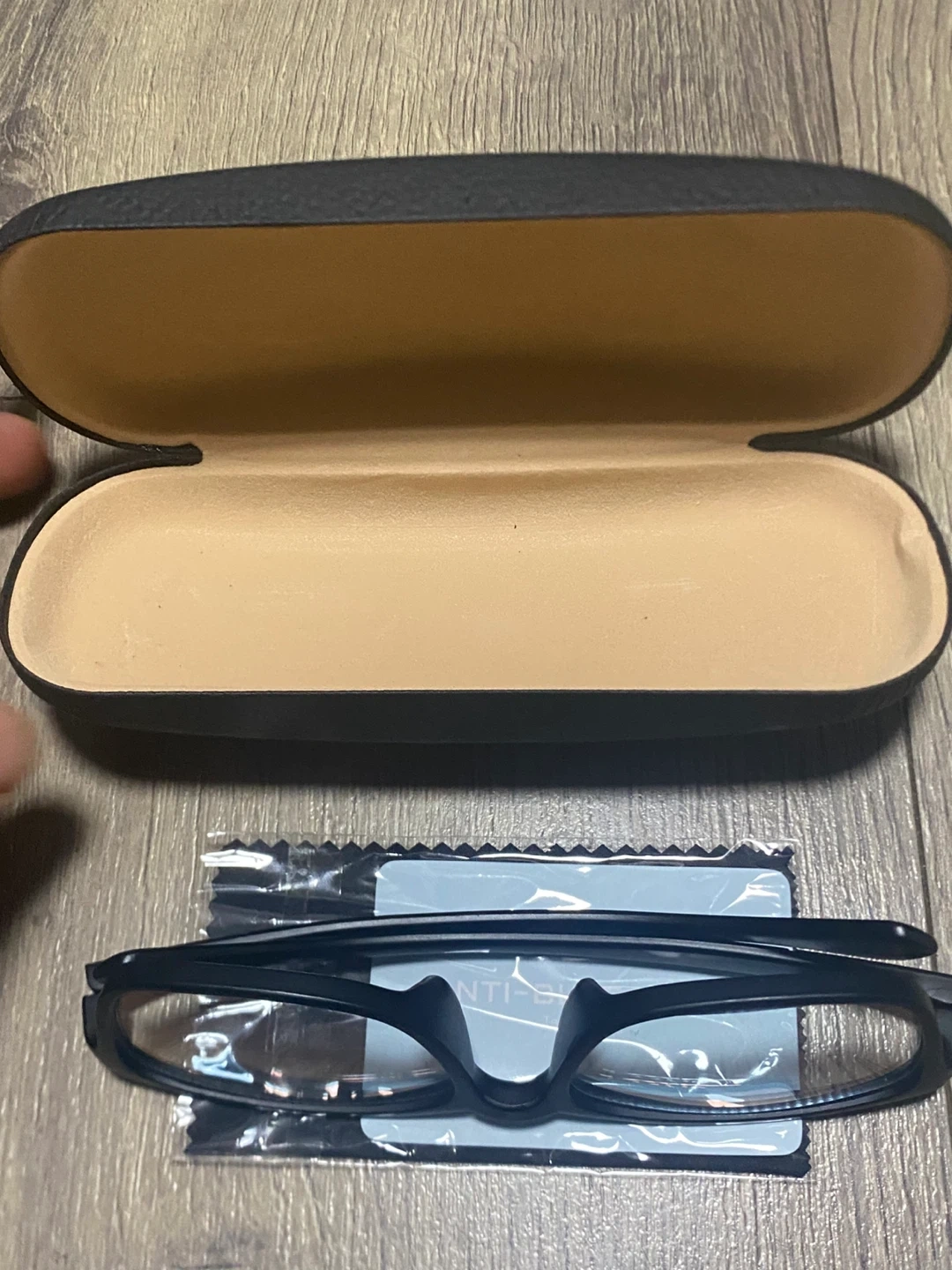 These glasses are designed to block blue light. They come with a protective case and a cleaning cloth. The frames are black and the lenses are clear.