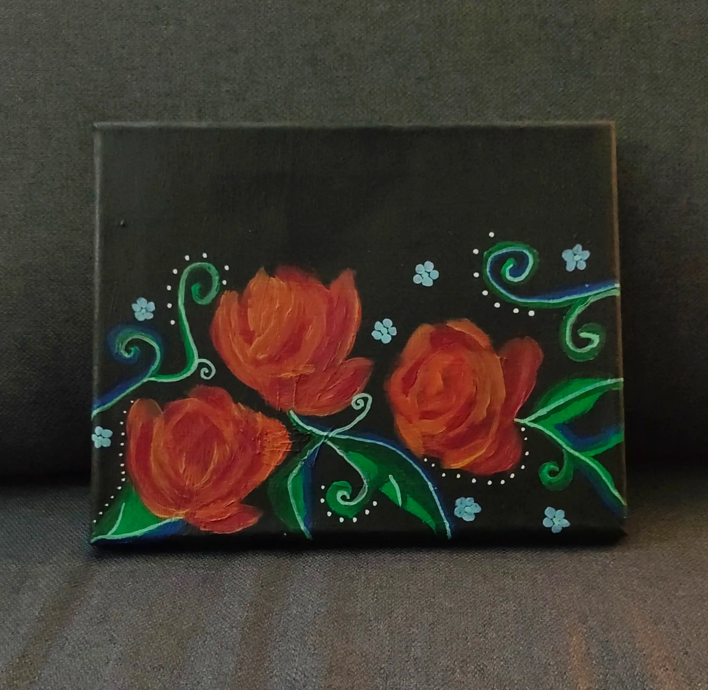 A small canvas features a hand-painted design of red roses with green leaves and swirling vines. Accents of tiny blue flowers add a pop of colour against the black background. It's a charming piece for any wall!