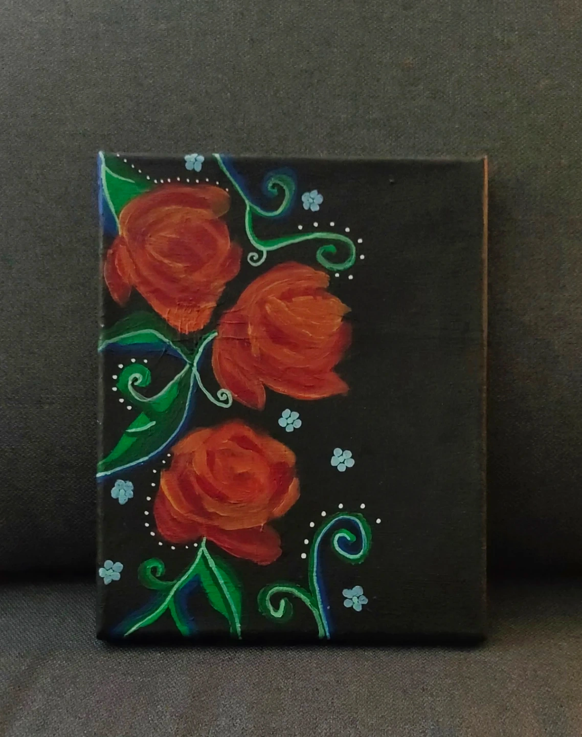 A small canvas features a hand-painted design of red roses with green leaves and swirling vines. Accents of tiny blue flowers add a pop of colour against the black background. It's a charming piece for any wall!