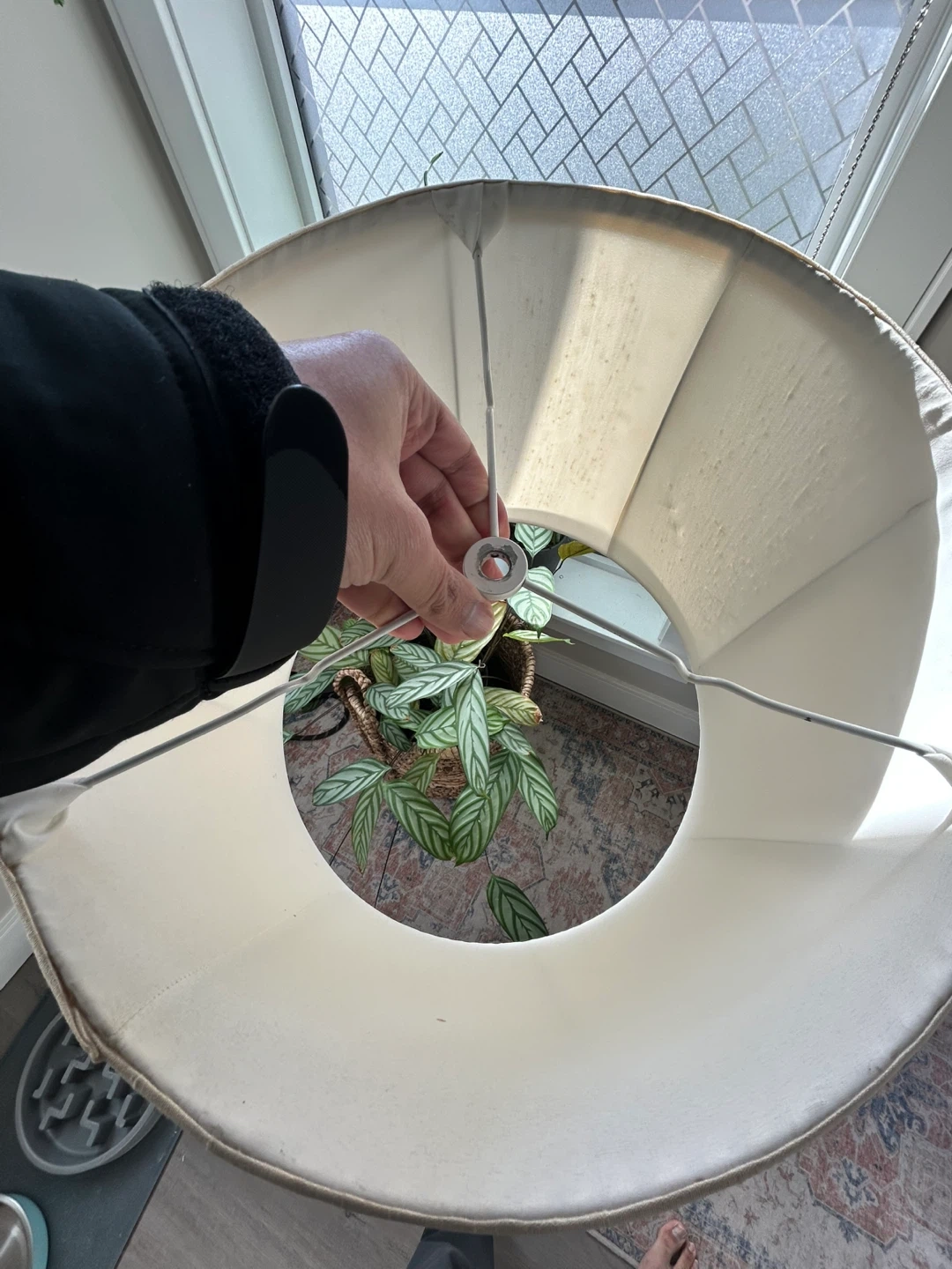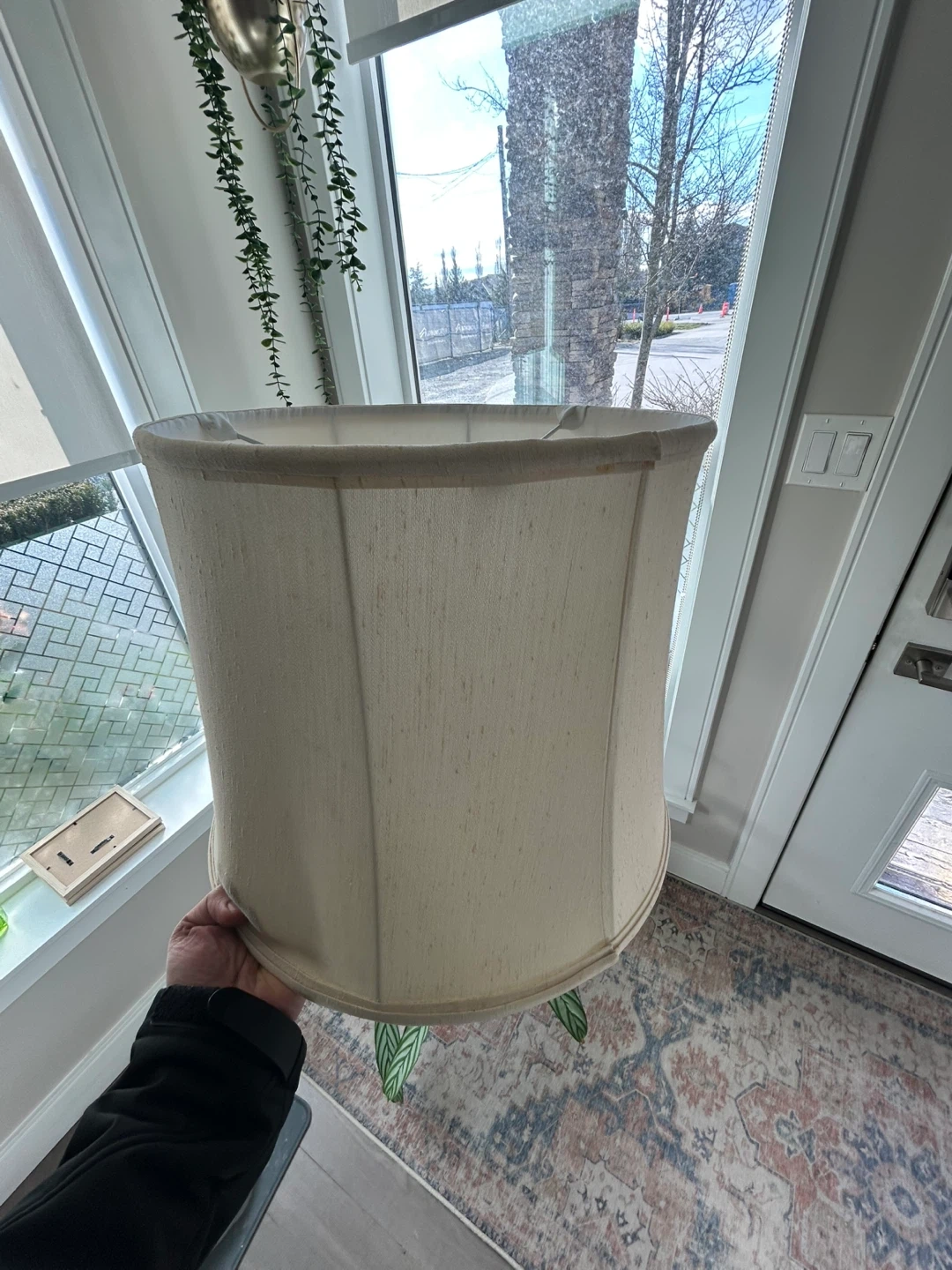 Cream coloured fabric lampshade. It has a bell shape and measures roughly 15 inches tall with a top diameter of about 7 inches and a bottom diameter of about 15 inches. This shade would fit well on a floor lamp.