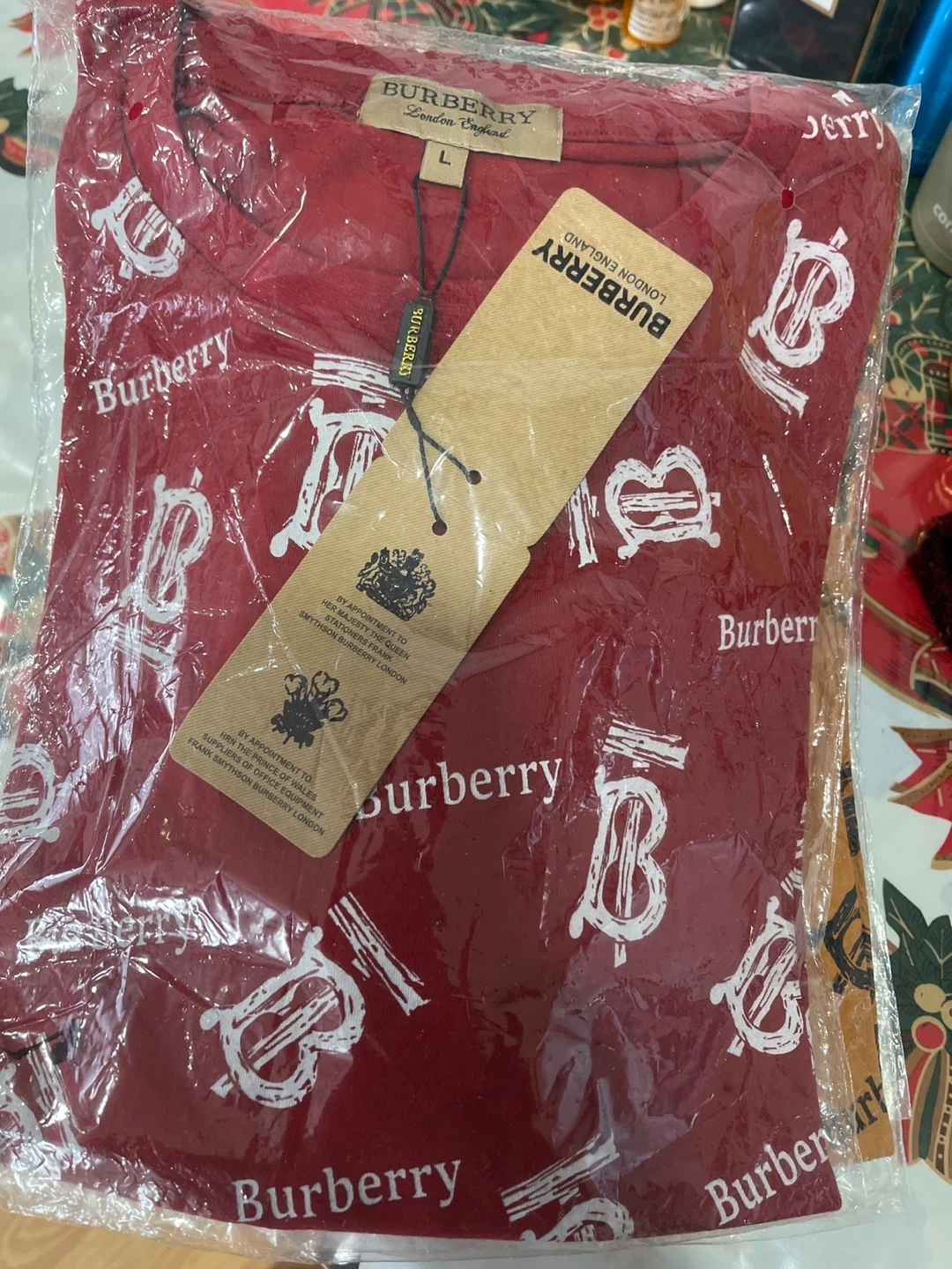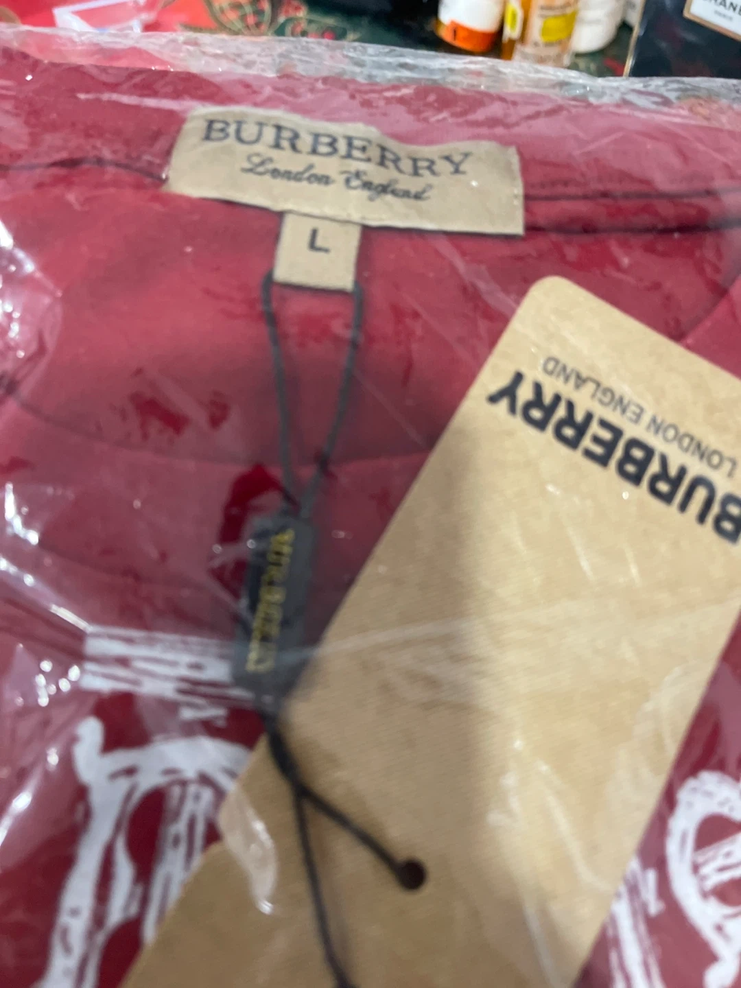 This is a Burberry London England graphic t-shirt. It's a size L and features a repeating Burberry logo pattern. The material is comfortable for everyday wear.