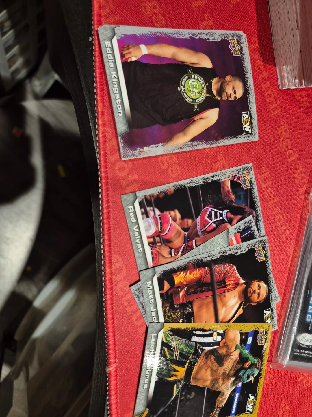 Collection of AEW Upper Deck trading cards featuring various wrestlers. Includes cards for Orange Cassidy, Kenny Omega, Eddie Kingston, Red Velvet, Matt Jade, and Luchasaurus. These are collectible cards for wrestling fans.