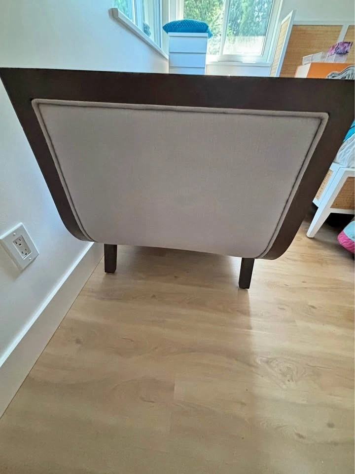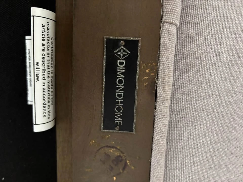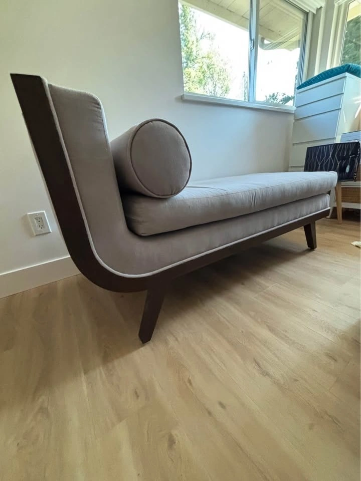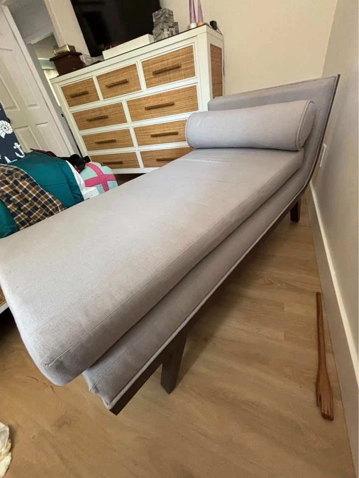 Stylish DIMONDHOME chaise lounge. Light gray upholstered fabric with a dark wood frame. Has a matching bolster pillow. Great for adding a comfy spot to your living room or bedroom.