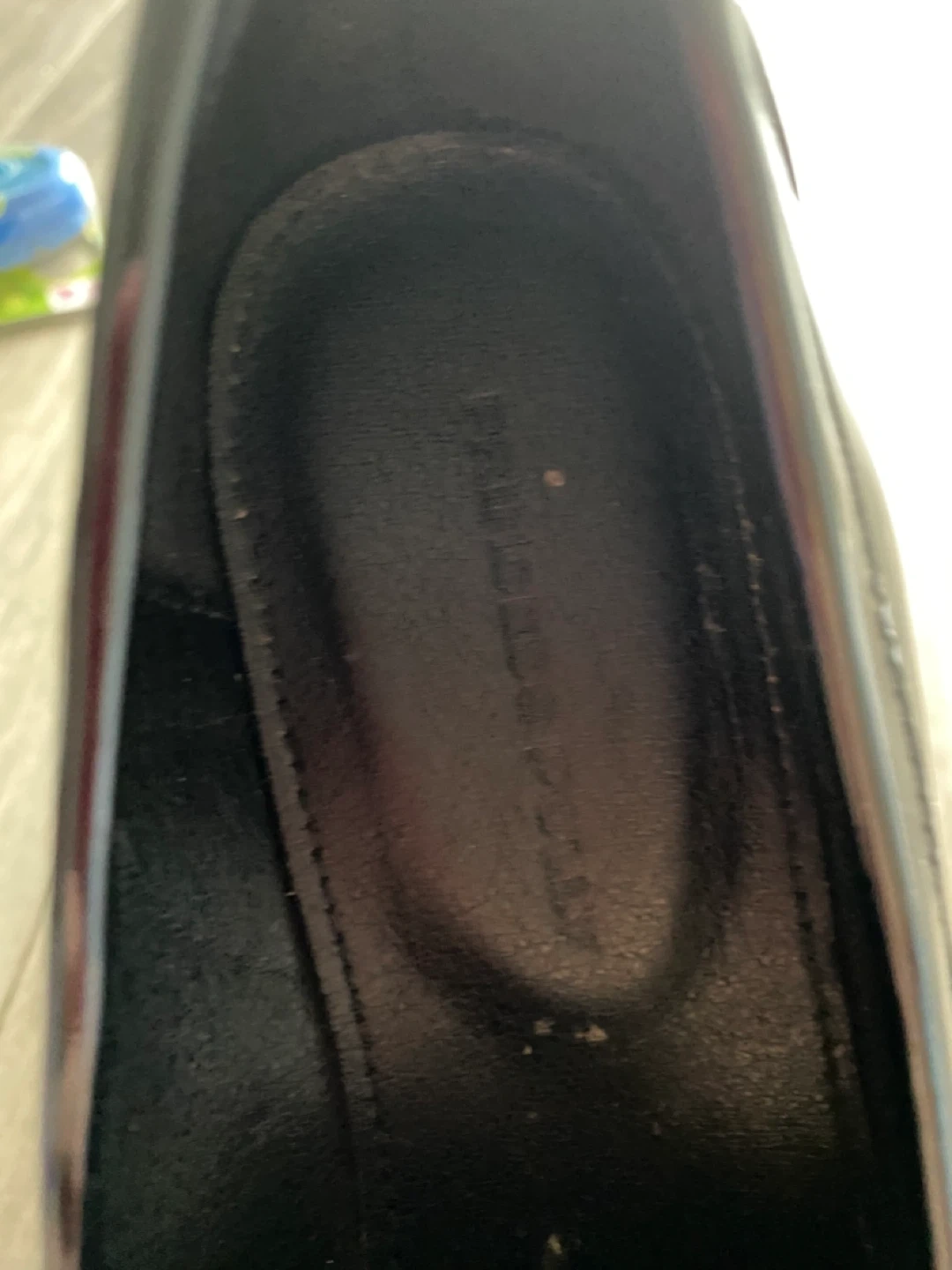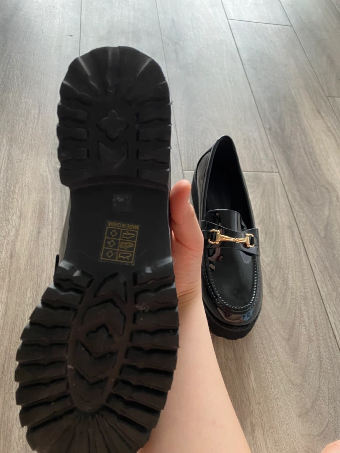 These shiny black patent loafers feature a chic gold buckle detail. They have a durable lug sole and a comfortable cushioned insole. Perfect for adding a stylish touch to any outfit!