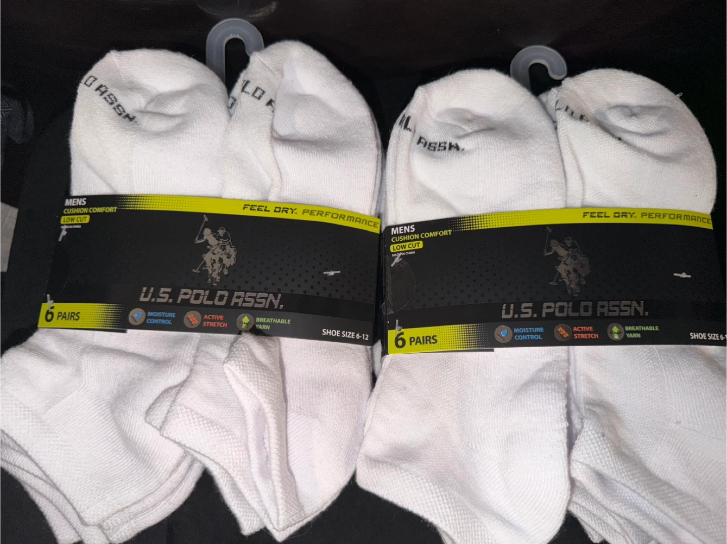 Six pairs of U.S. Polo Assn. unisex low-cut socks. They're made with breathable yarn for cushion comfort and a dry performance feel. Shoe size 6-12.