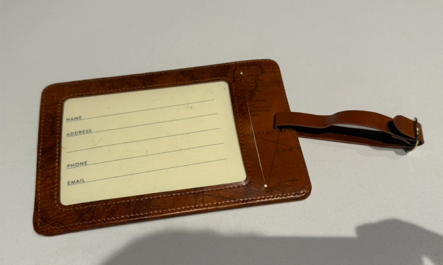 This is a brown leather luggage tag with a world map design. It has a space on the back for your name, address, phone, and email. The strap is made of brown leather.