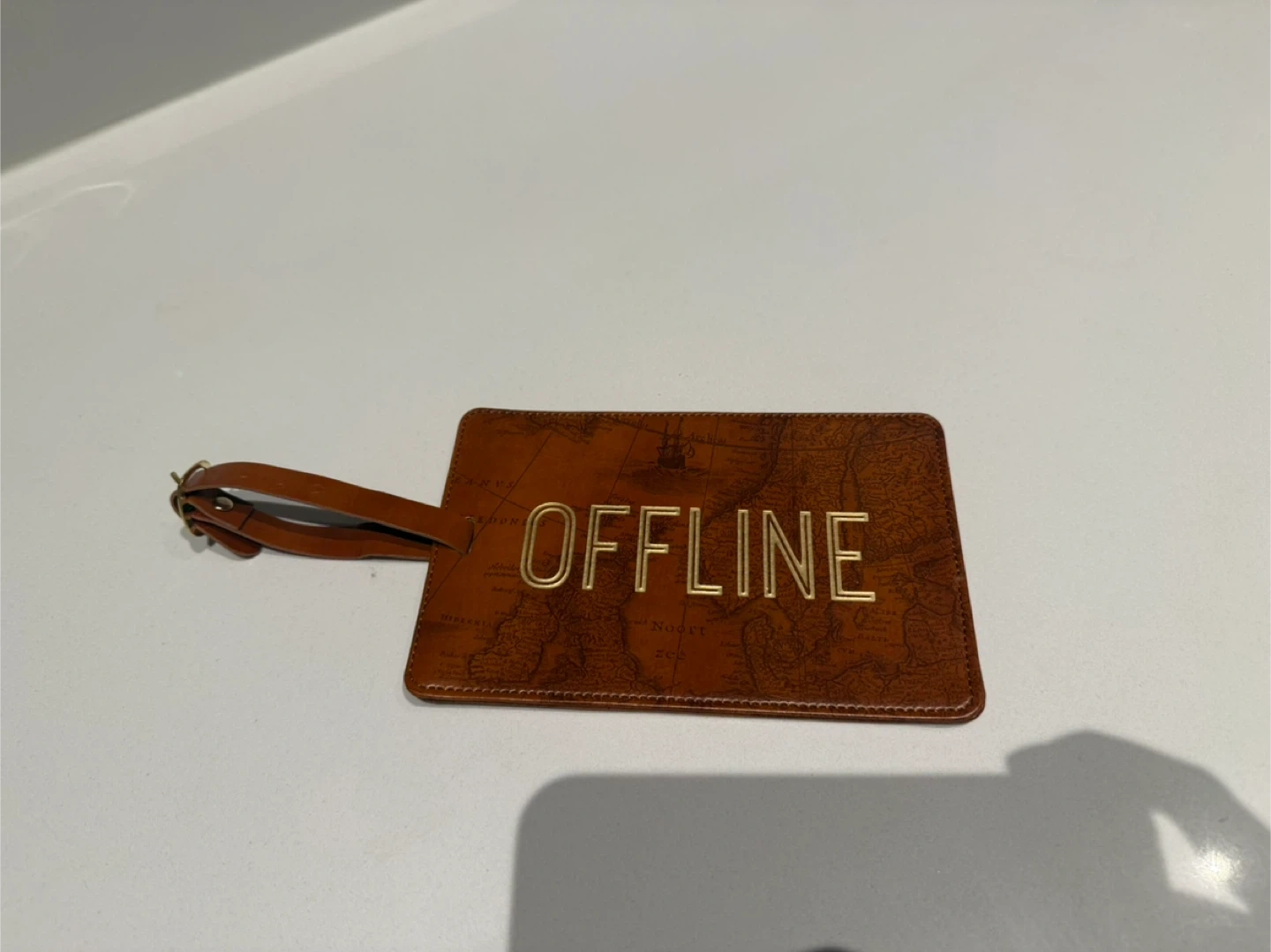 This is a brown leather luggage tag with a world map design. It has a space on the back for your name, address, phone, and email. The strap is made of brown leather.