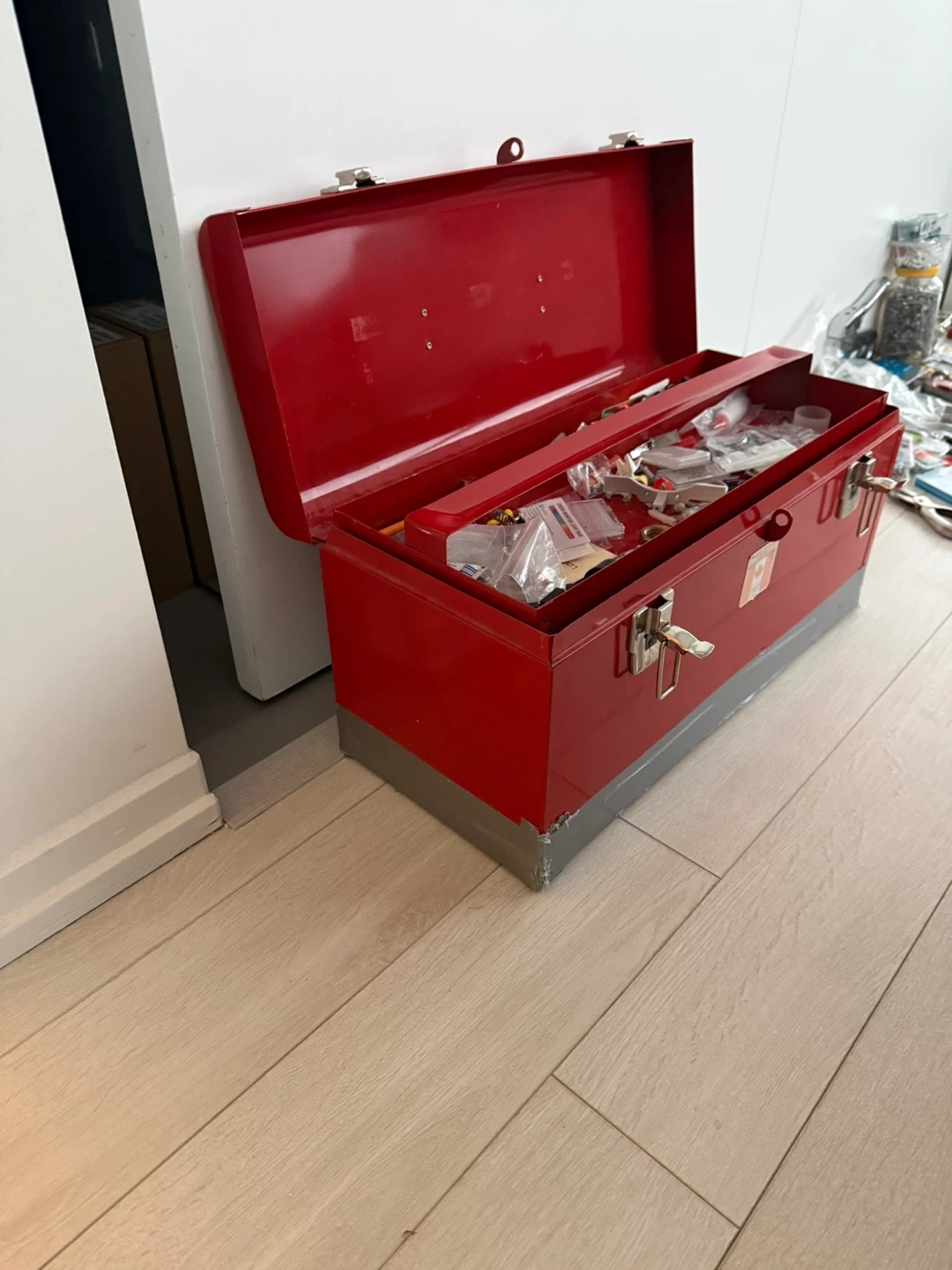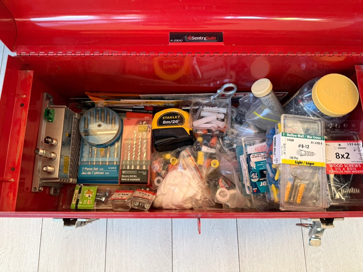 This is a used tool lot that includes a toolbox and an assortment of tools, including screwdrivers, drill bits (some in original packaging unused), Alan Keys, cutting tools with a pack of brand new blades, glass cutting tool, wrenches, pliers, wiring tools, clamps and connectors, hundreds of finishing nails and screws of all kinds and sizes, large assortment of various anchors, brackets as well as other items. These tools are ideal for various repair and maintenance tasks. Some tools have some signs of minor wear but are in good working condition. Cash accepted. Let me know if you're interested!