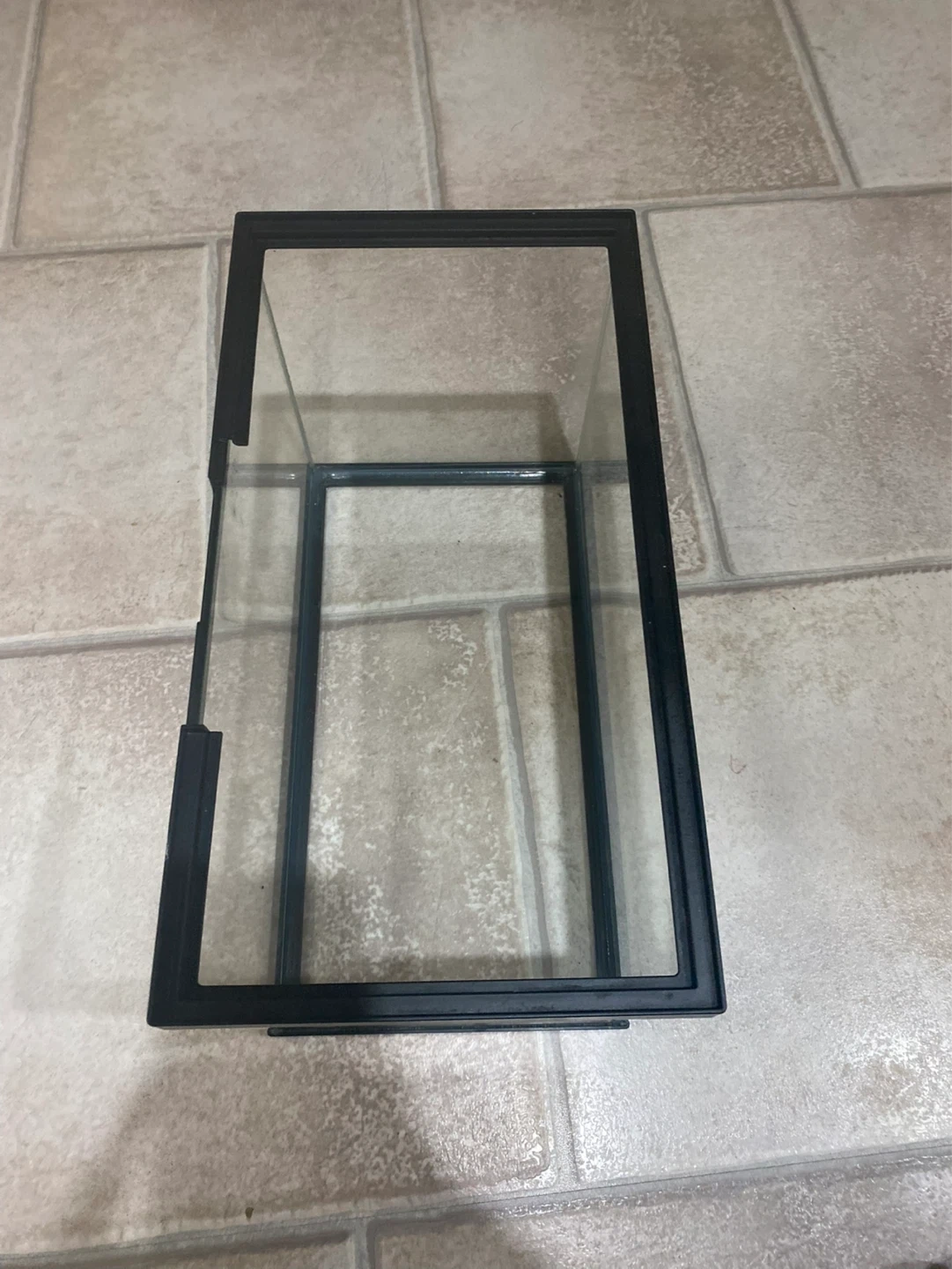 This is a glass terrarium with a black frame. It's suitable for small pets or as a starter aquarium. Tank dimensions are approximately 3 gallons.