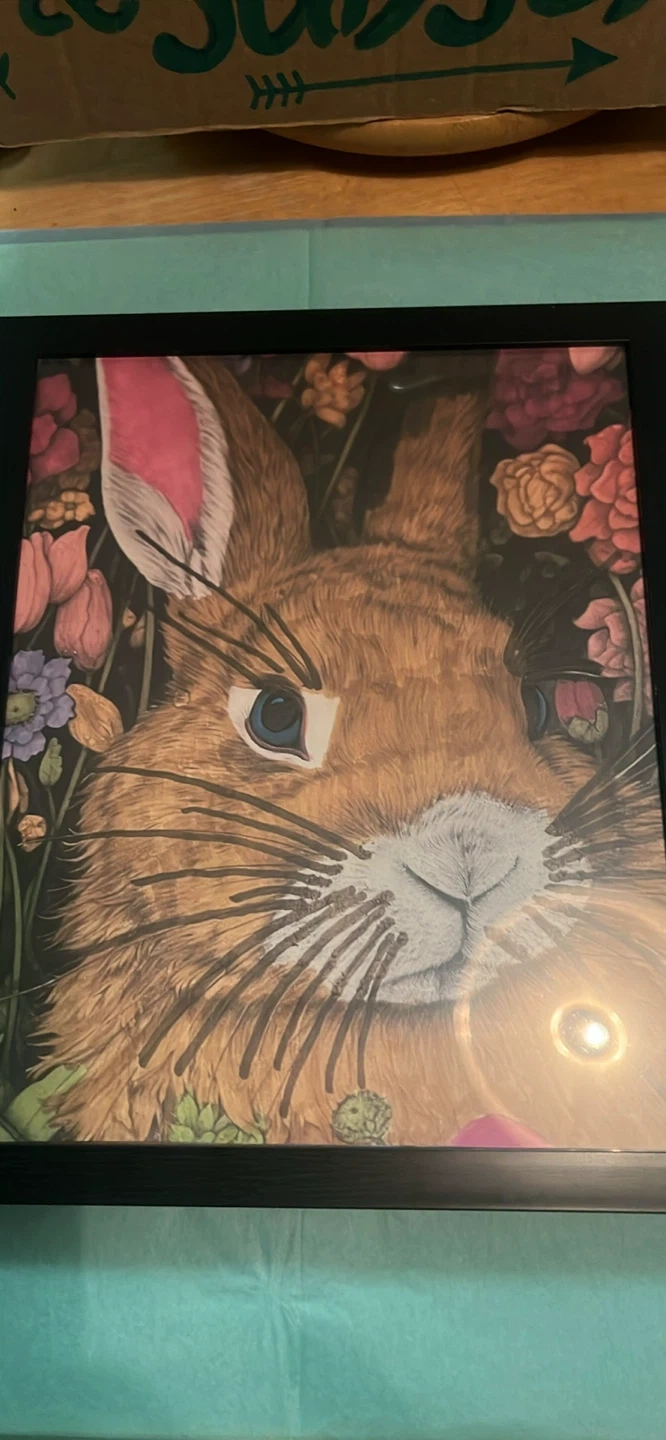 Black framed art print featuring a detailed illustration of a rabbit surrounded by flowers. It's ready to hang or stand on a desk. This piece adds a lovely touch to any room and perfect for spring and Easter time. It comes in a cute plastic frame and you get a copy of the original. All artwork is done by me and is 8 x 10. It can be mailed to you and or you can come and pick it up. I am located in the beaches area of Toronto
