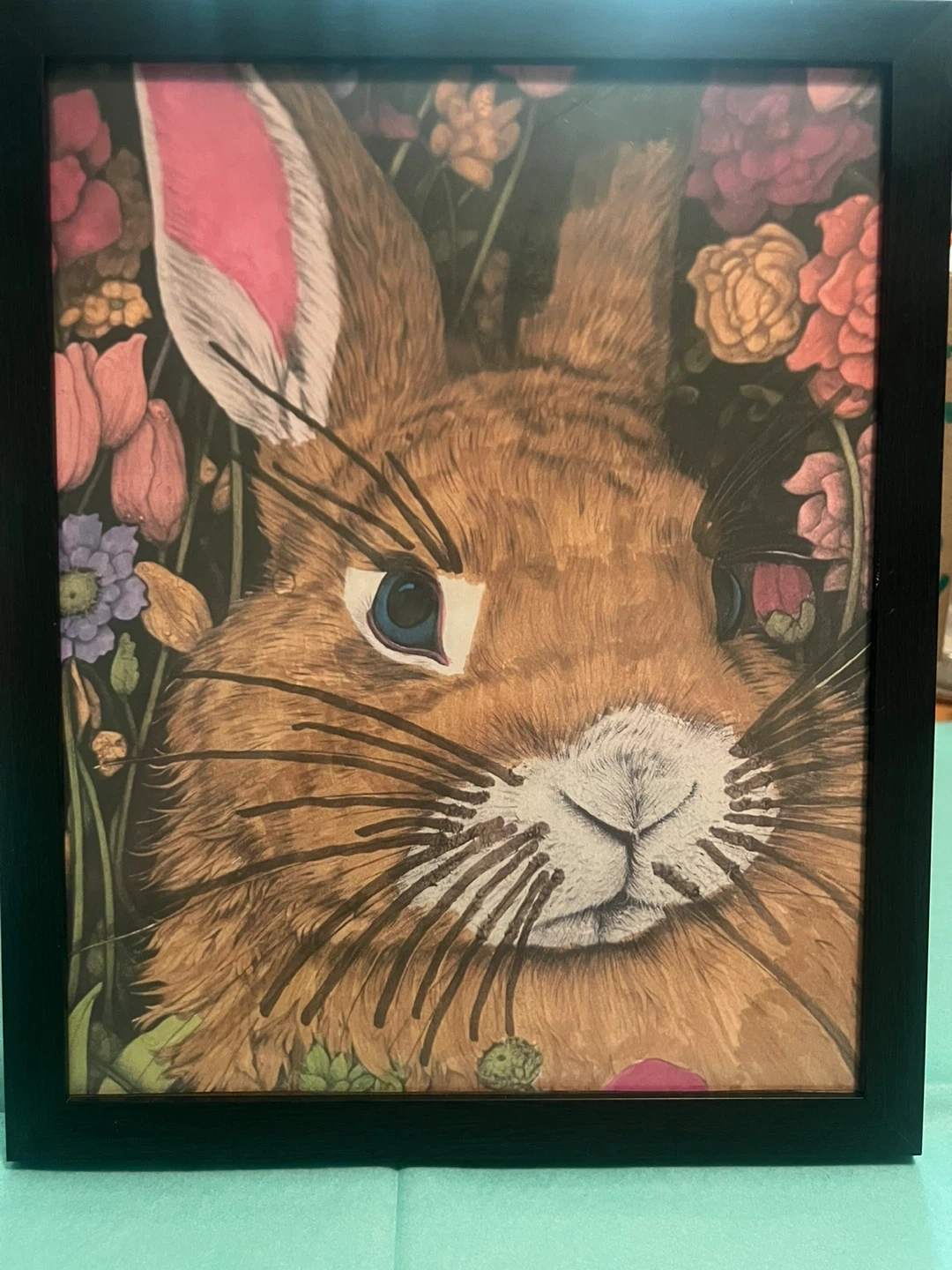 Black framed art print featuring a detailed illustration of a rabbit surrounded by flowers. It's ready to hang or stand on a desk. This piece adds a lovely touch to any room and perfect for spring and Easter time. It comes in a cute plastic frame and you get a copy of the original. All artwork is done by me and is 8 x 10. It can be mailed to you and or you can come and pick it up. I am located in the beaches area of Toronto