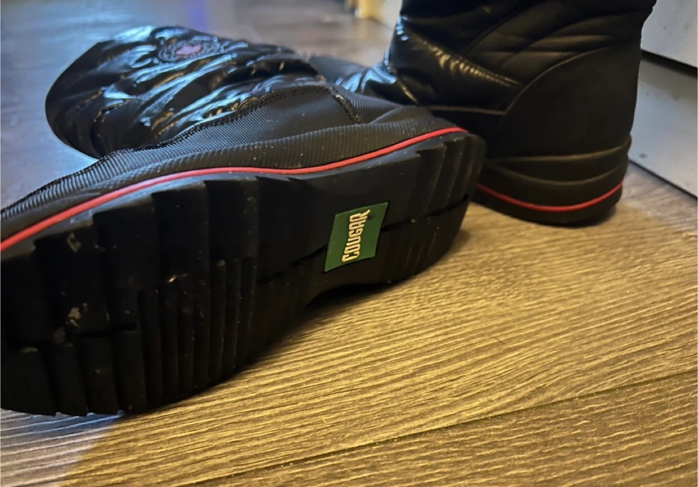 Cougar puffer boots in black. These boots feature a water-resistant nylon shell and a drawstring closure for a snug fit. The rubber sole offers good traction.