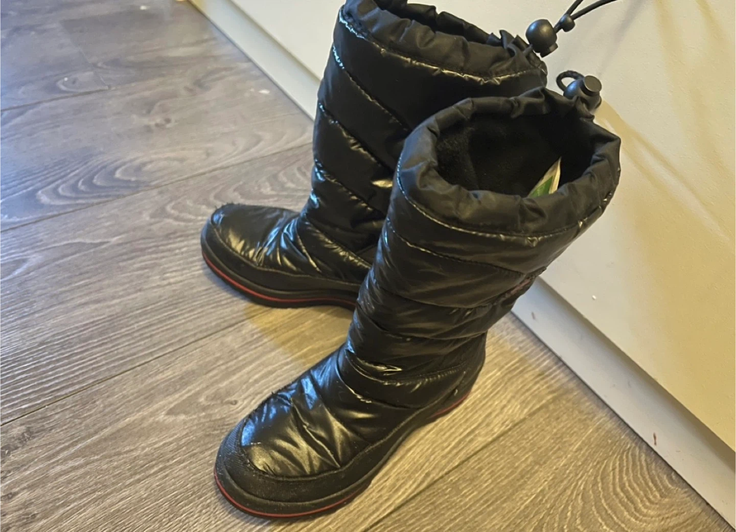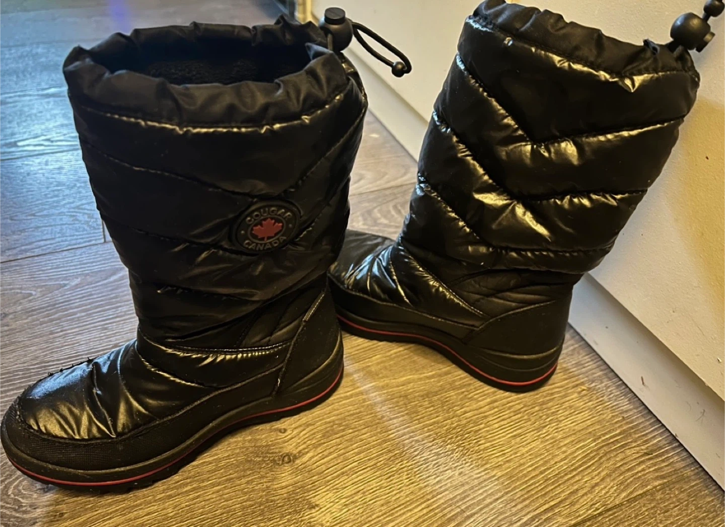 Cougar puffer boots in black. These boots feature a water-resistant nylon shell and a drawstring closure for a snug fit. The rubber sole offers good traction.