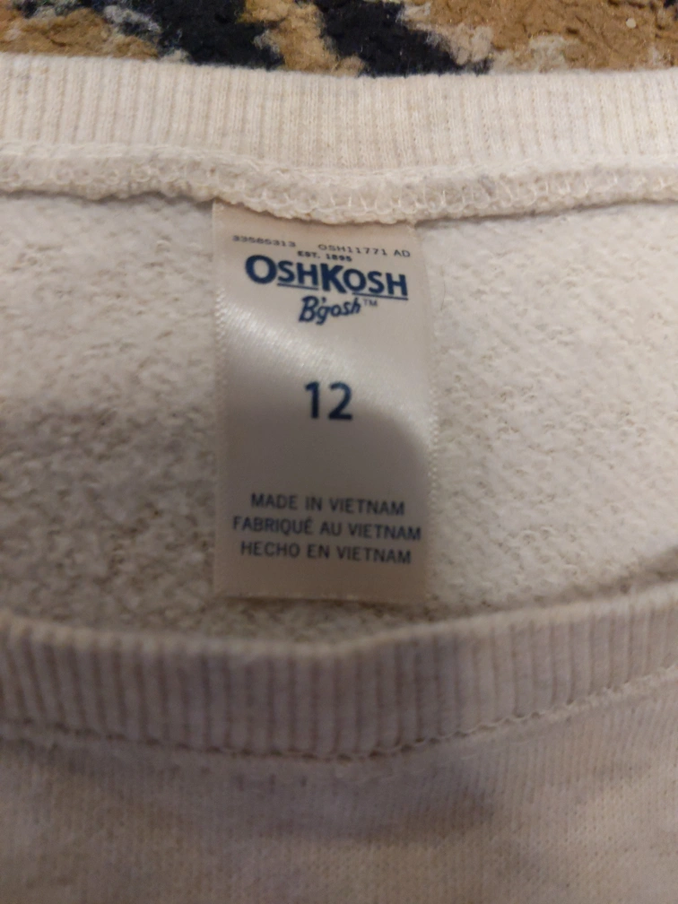 White long-sleeved sweater with a flip sparkle pattern. Size is 12 years old and another same one is available that is size 10 years old. The brand is Osh-Kosh and the condition is like new, only worn a few times. One is for $5 and two are for $10. Payment is cash only and pickup only please buy!