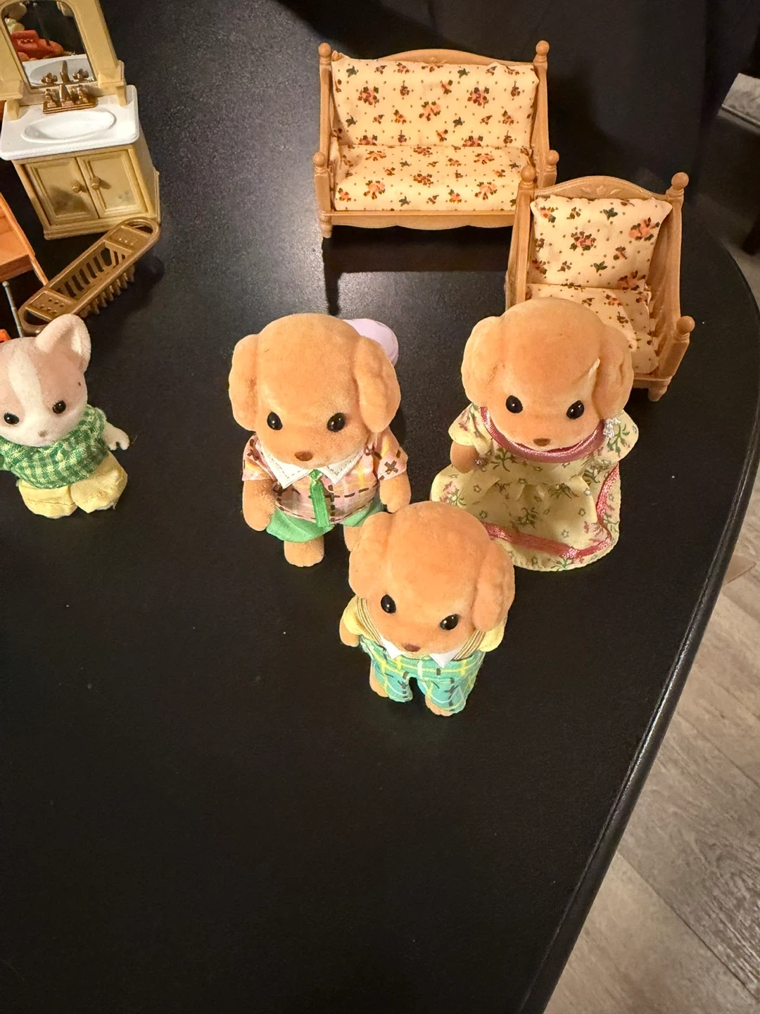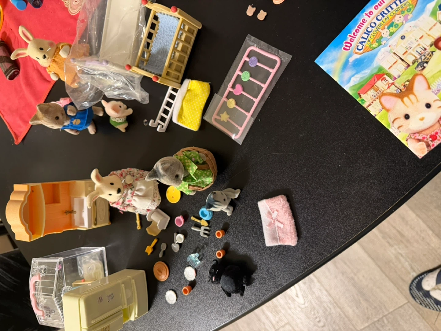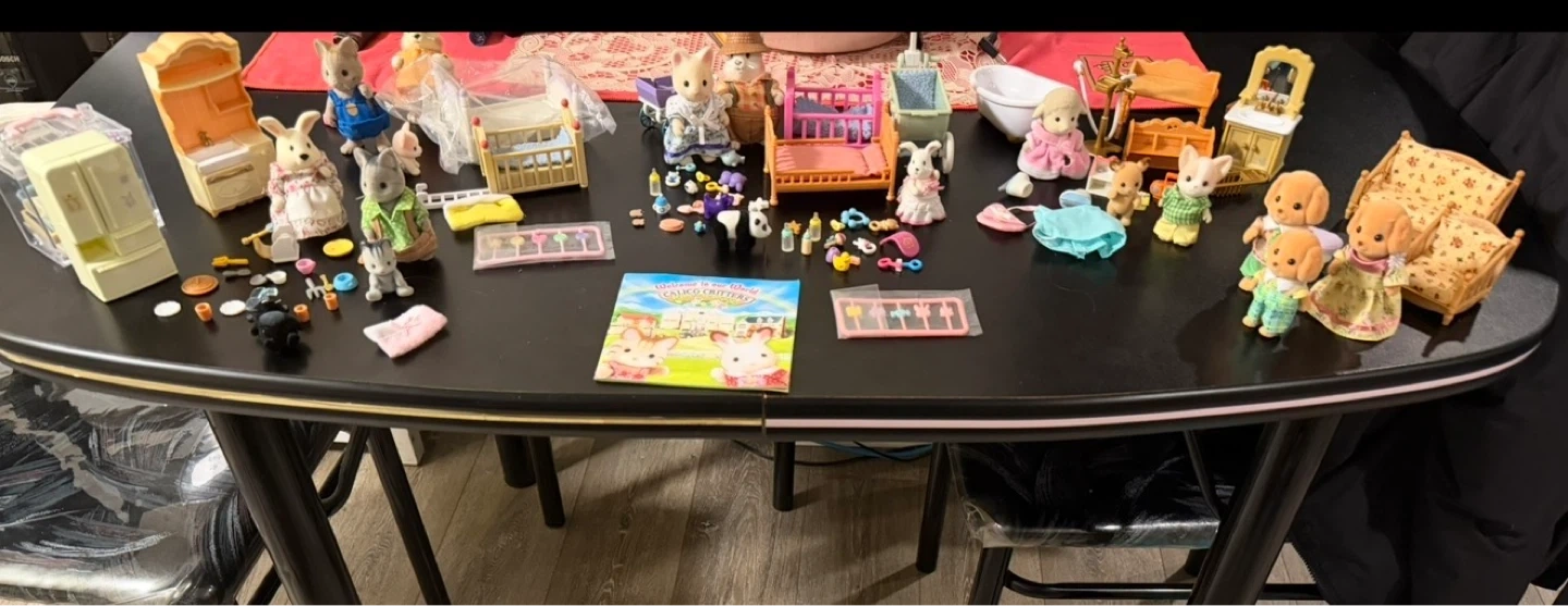 A collection of Calico Critters miniature dollhouse furniture and animal figures. Includes various accessories and furniture pieces for imaginative play. Perfect for collectors or for kids to create their own stories!