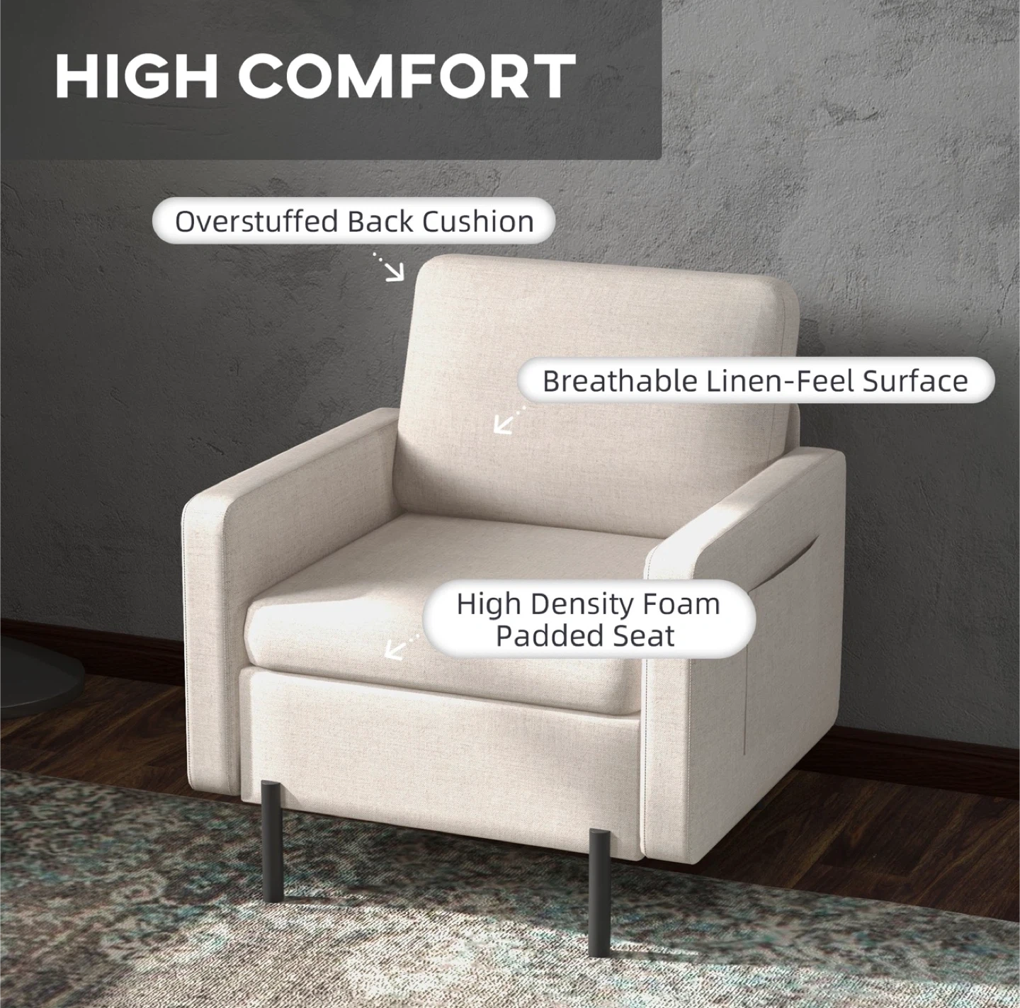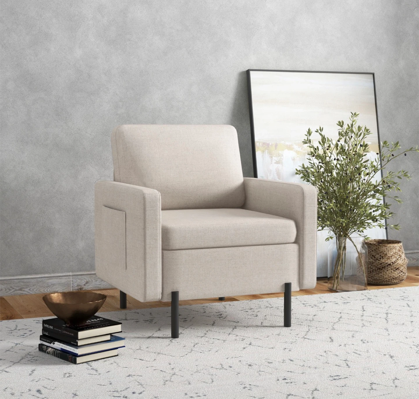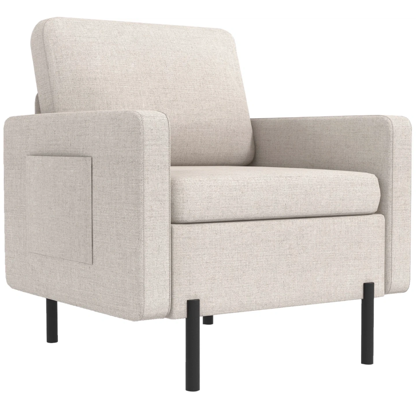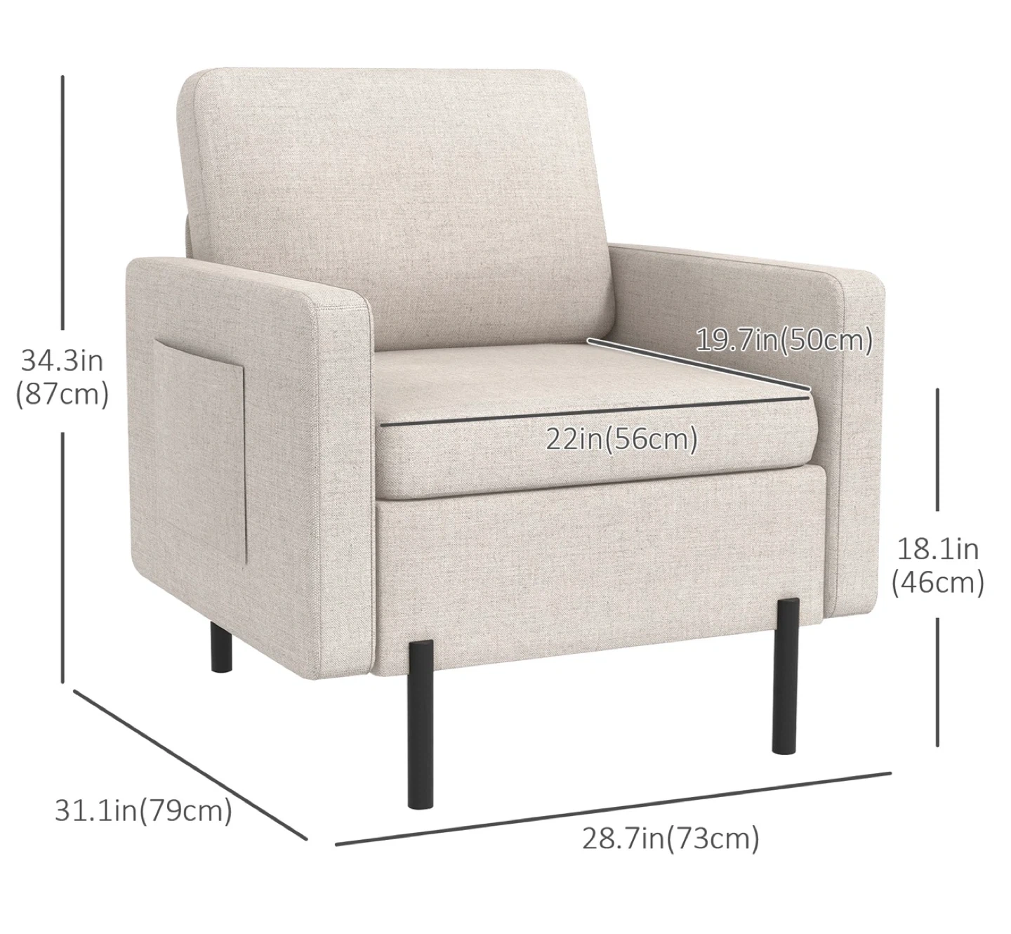 This accent chair offers a breathable linen-feel surface and high-density foam padded seat. It features an overstuffed back cushion for comfort. Overall dimensions are 31.1in W x 28.7in D x 34.3in H.
