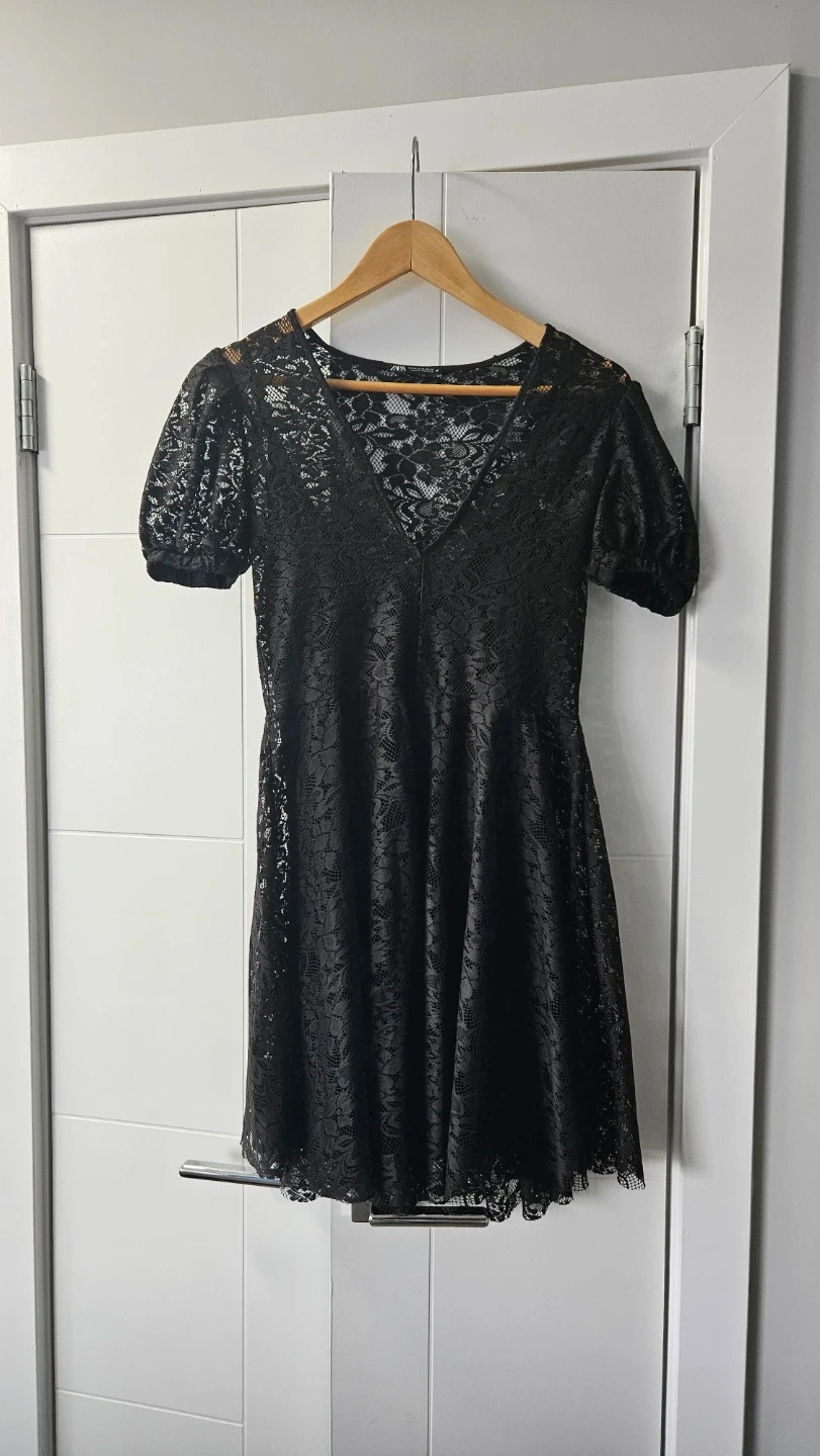 This Zara dress is made from a black lace material. It features a V-neckline and short puffed sleeves. Perfect for a night out!