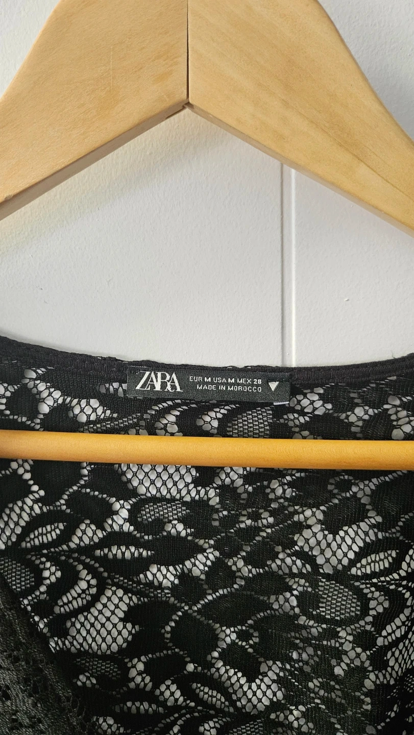 This Zara dress is made from a black lace material. It features a V-neckline and short puffed sleeves. Perfect for a night out!