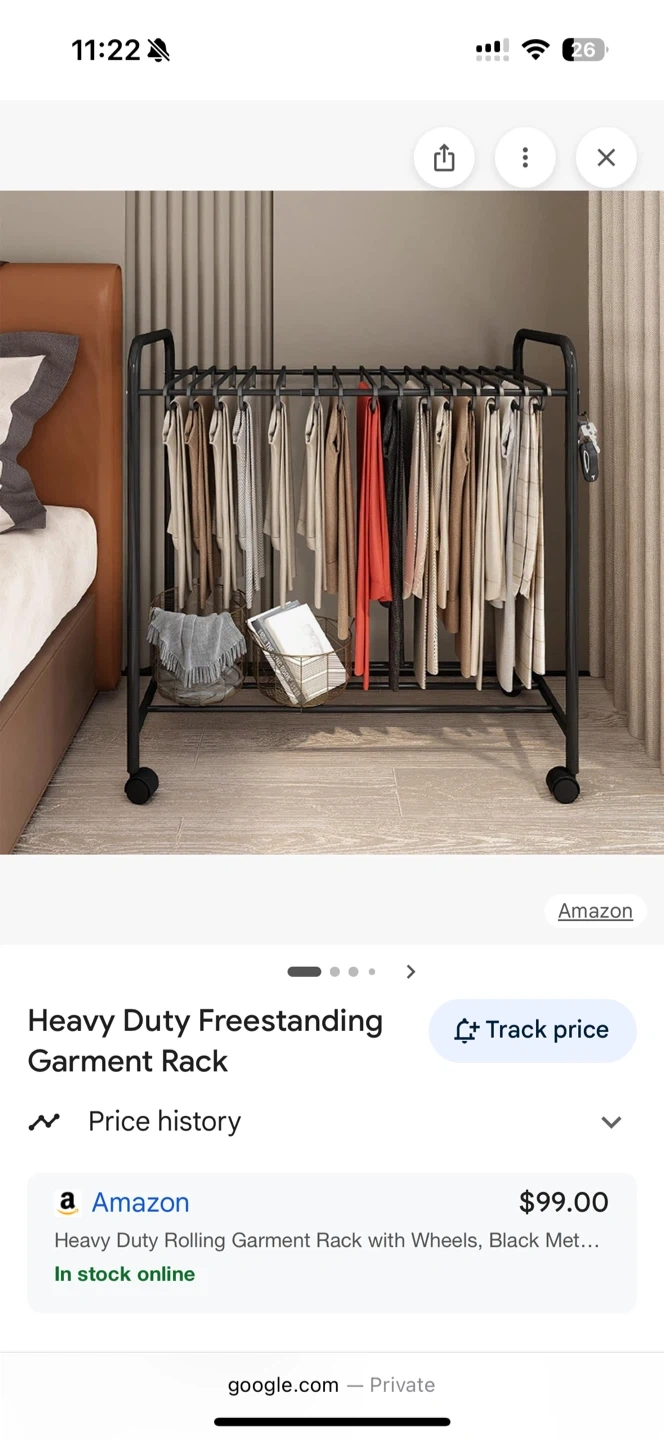 Selling a heavy-duty rolling garment rack with wheels. It's black metal and in great condition. Originally bought for $99. Perfect for organizing your clothes!