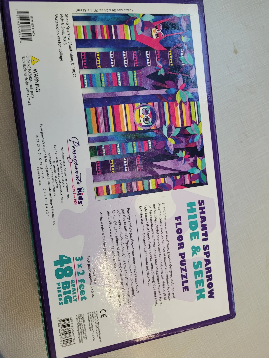 Looking to sell this Shanti Sparrow Hide & Seek Floor Puzzle. It's from Pomegranate Kids and includes 48 really big pieces, perfect for little hands! The puzzle size is 36 x 24 inches (91.4 x 61 cm). It features colourful illustrations by Shanti Sparrow, inspired by nature and storytelling