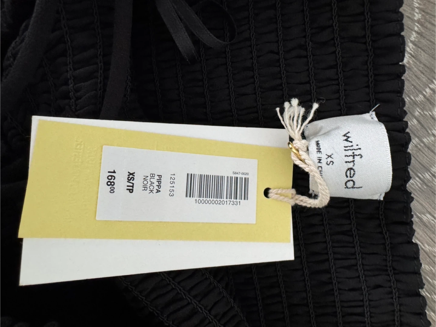 This is a black smocked dress from Wilfred. It's a size XS, made in China. The dress has a floral detail on the bust and a flowing skirt.