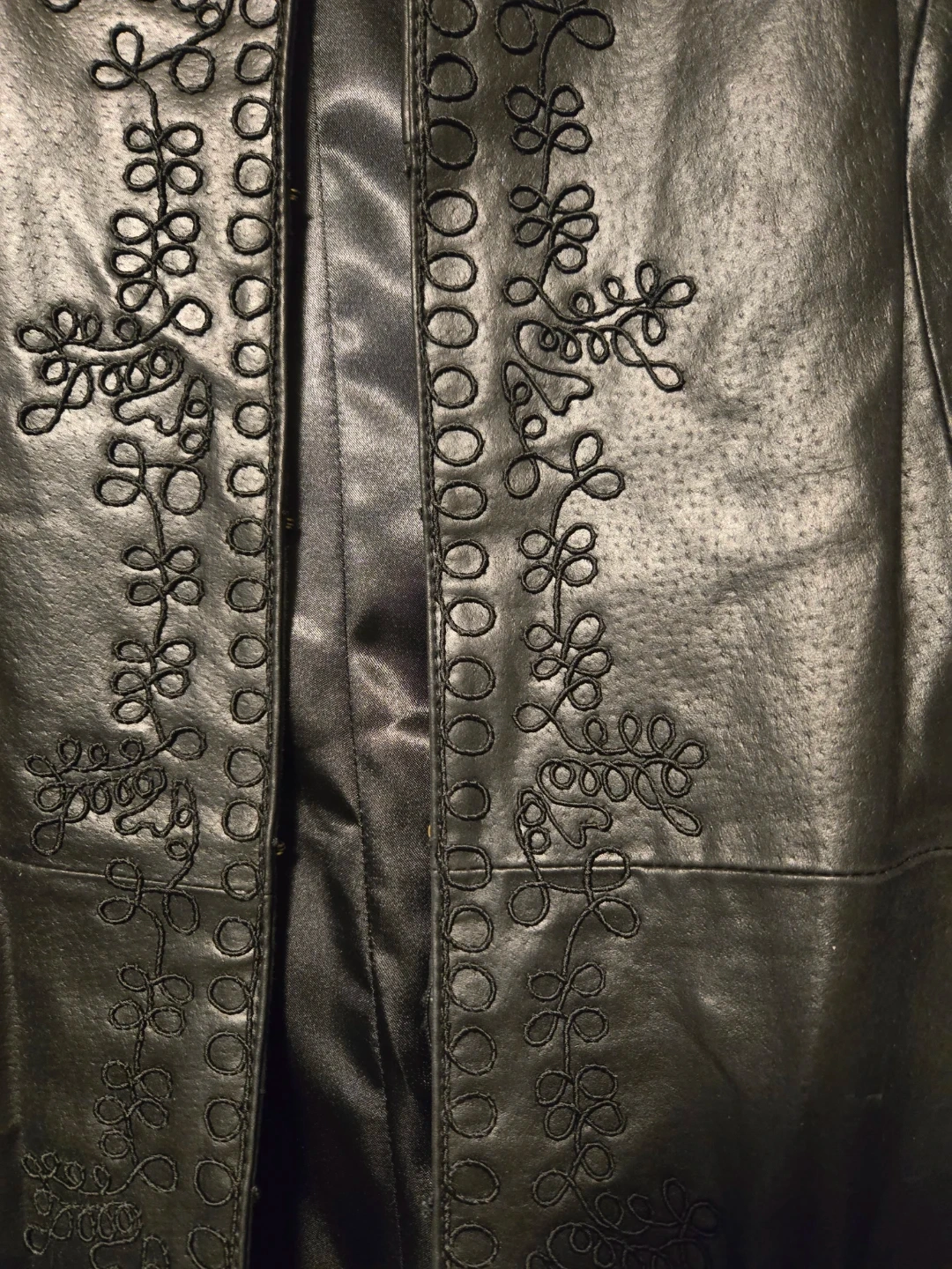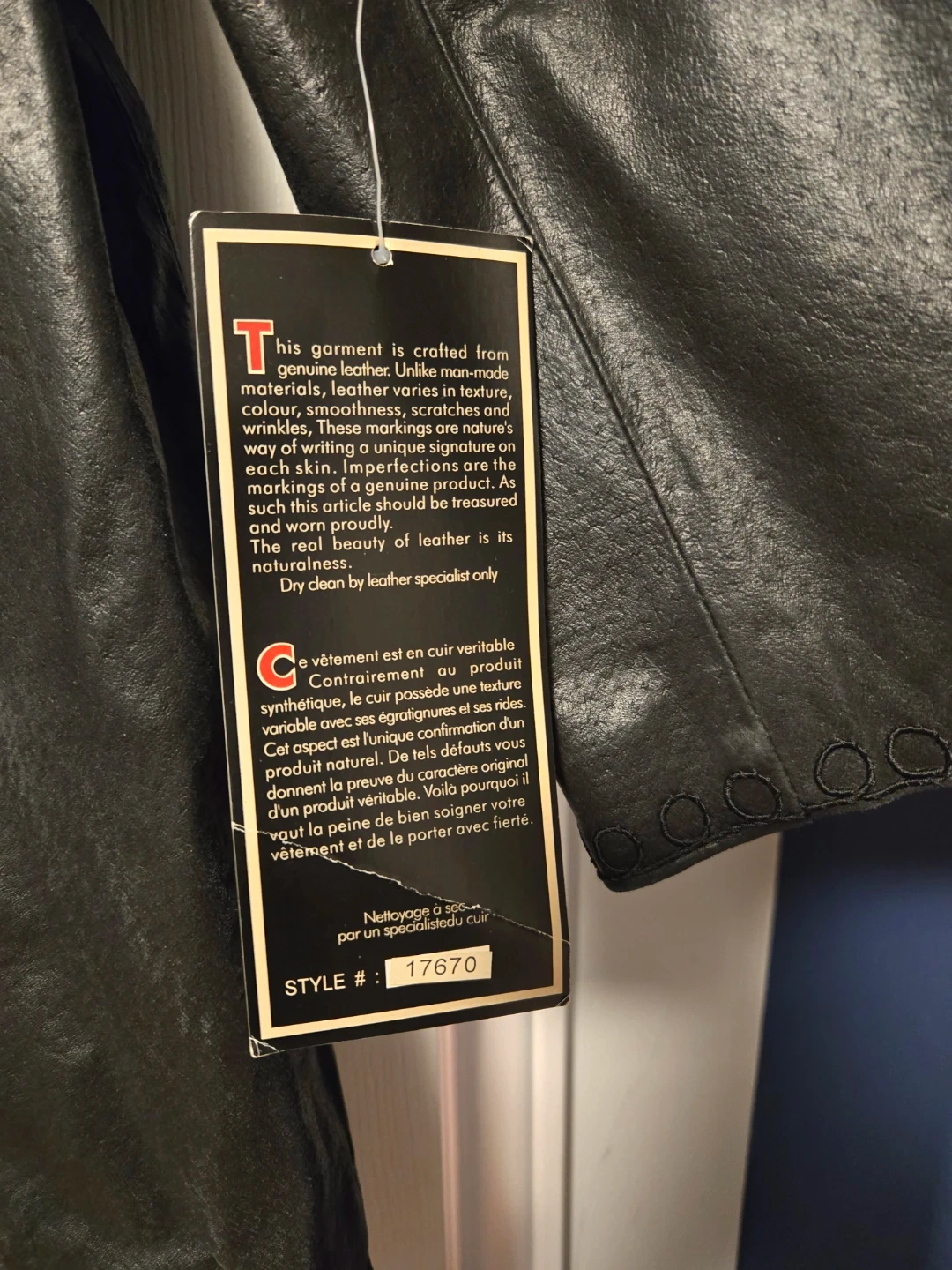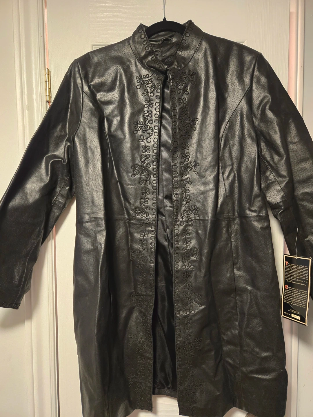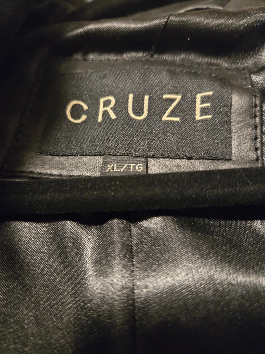 This is a genuine leather coat from Cruze in size XL. It's a stylish black colour with unique markings making it a one-of-a-kind piece. It should be dry cleaned by a leather specialist only to keep it in tip top shape