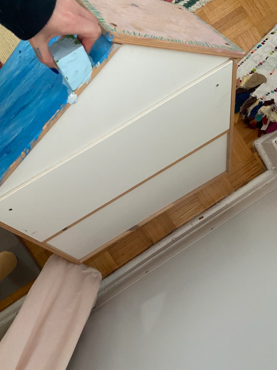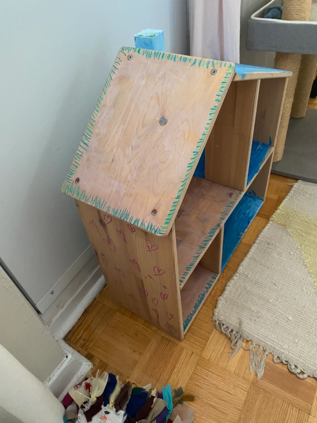 The only thing is that it has drawings and paint all over so you’d want to sand it and repaint it. The stains that look like water damage aren’t that; that’s just spread out watercolour paint (the wood isn’t damaged).