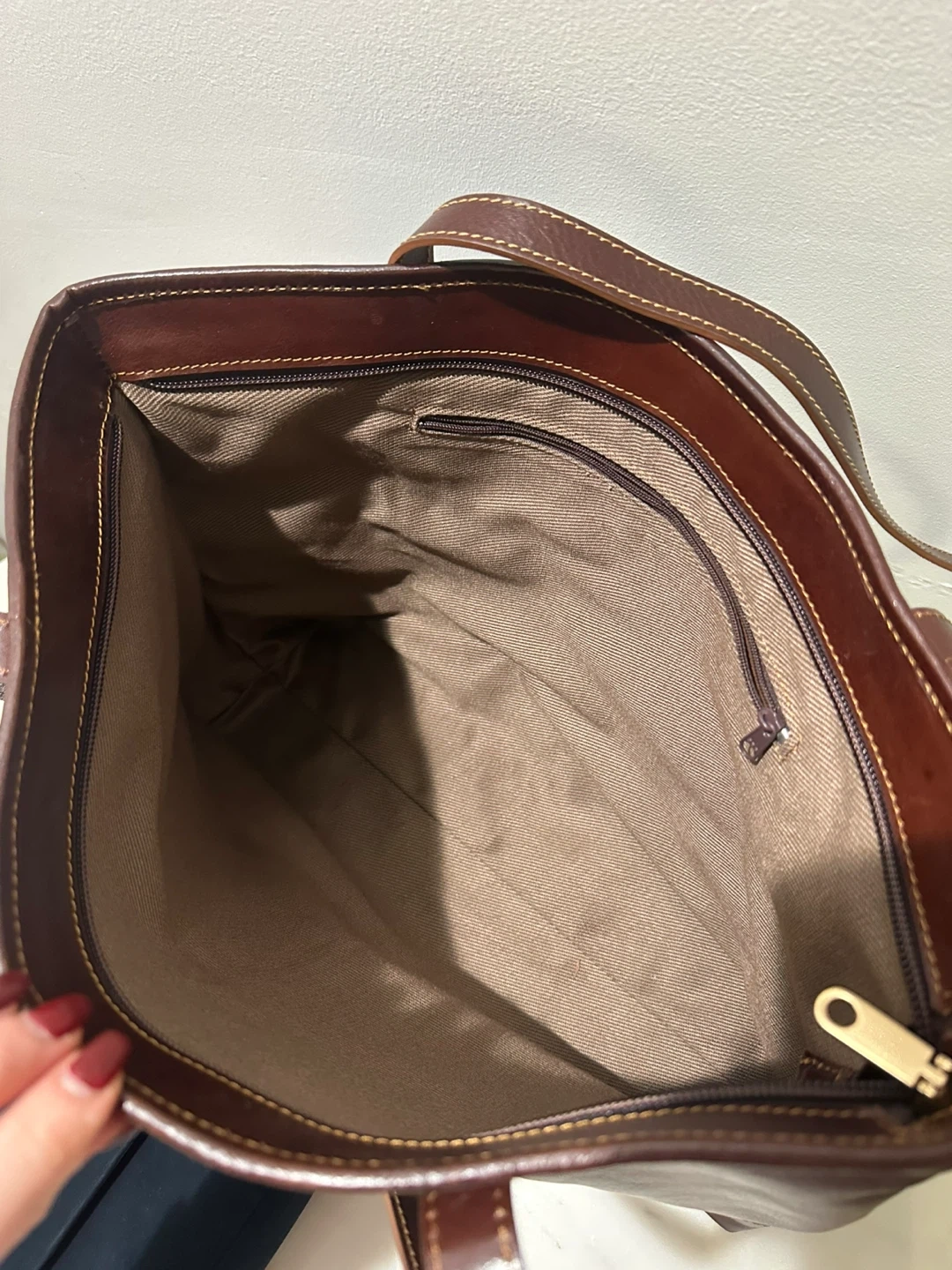 Selling a leather tote bag and a handbag. Both are in great condition and ready for a new owner! The tote bag is a rich brown color, and the handbag is a dark blue color.