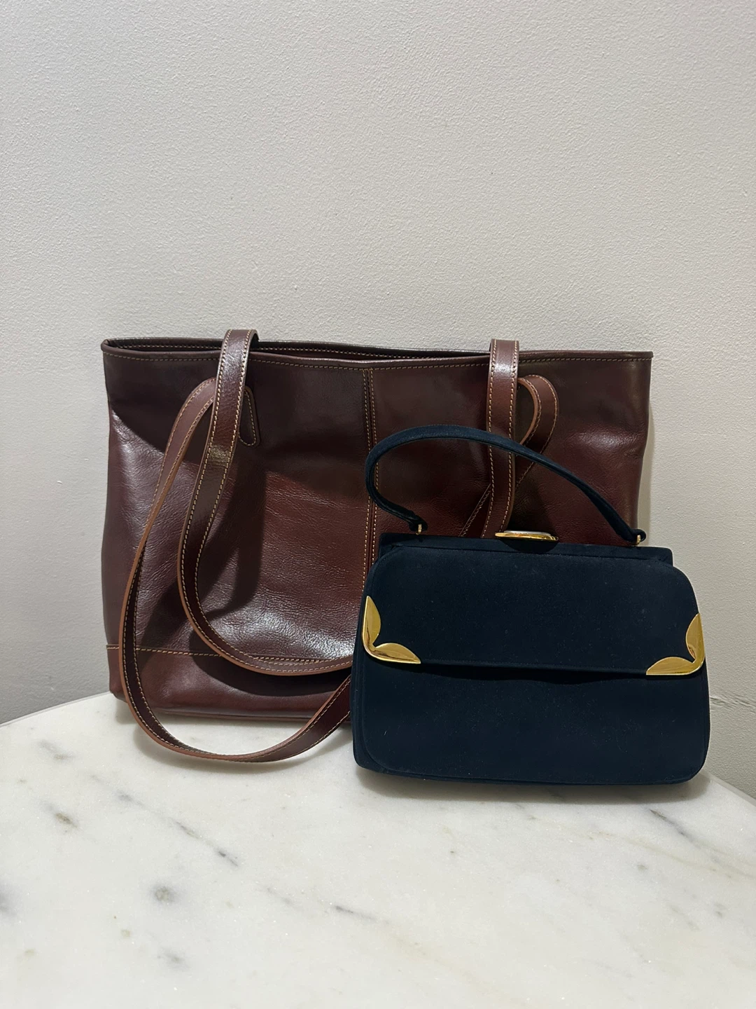 Selling a leather tote bag and a handbag. Both are in great condition and ready for a new owner! The tote bag is a rich brown color, and the handbag is a dark blue color.