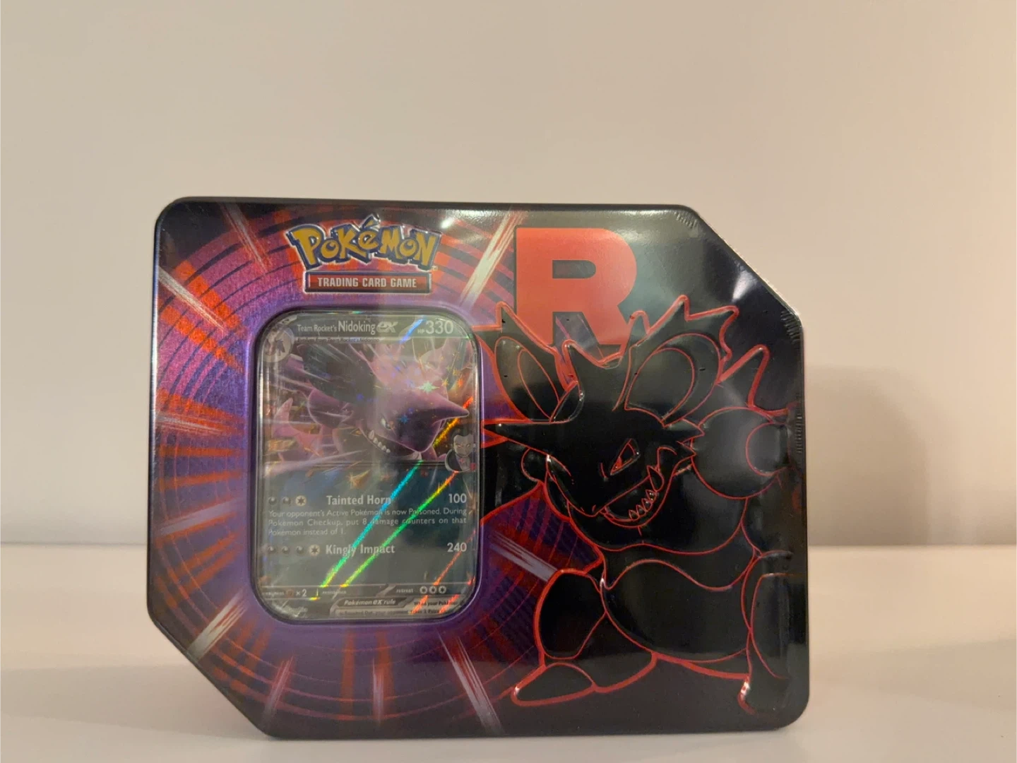 Set of 3 sealed Pokémon Trading Card Game Team Rocket tins featuring Team Rocket’s Mewtwo ex, Team Rocket’s Nidoking ex, and Team Rocket’s Persian ex promo cards. Each tin is factory sealed and includes 5 Pokémon TCG booster packs plus a code card for Pokémon TCG Live. Great for collectors, sealed product investors, or anyone looking to chase Team Rocket cards.