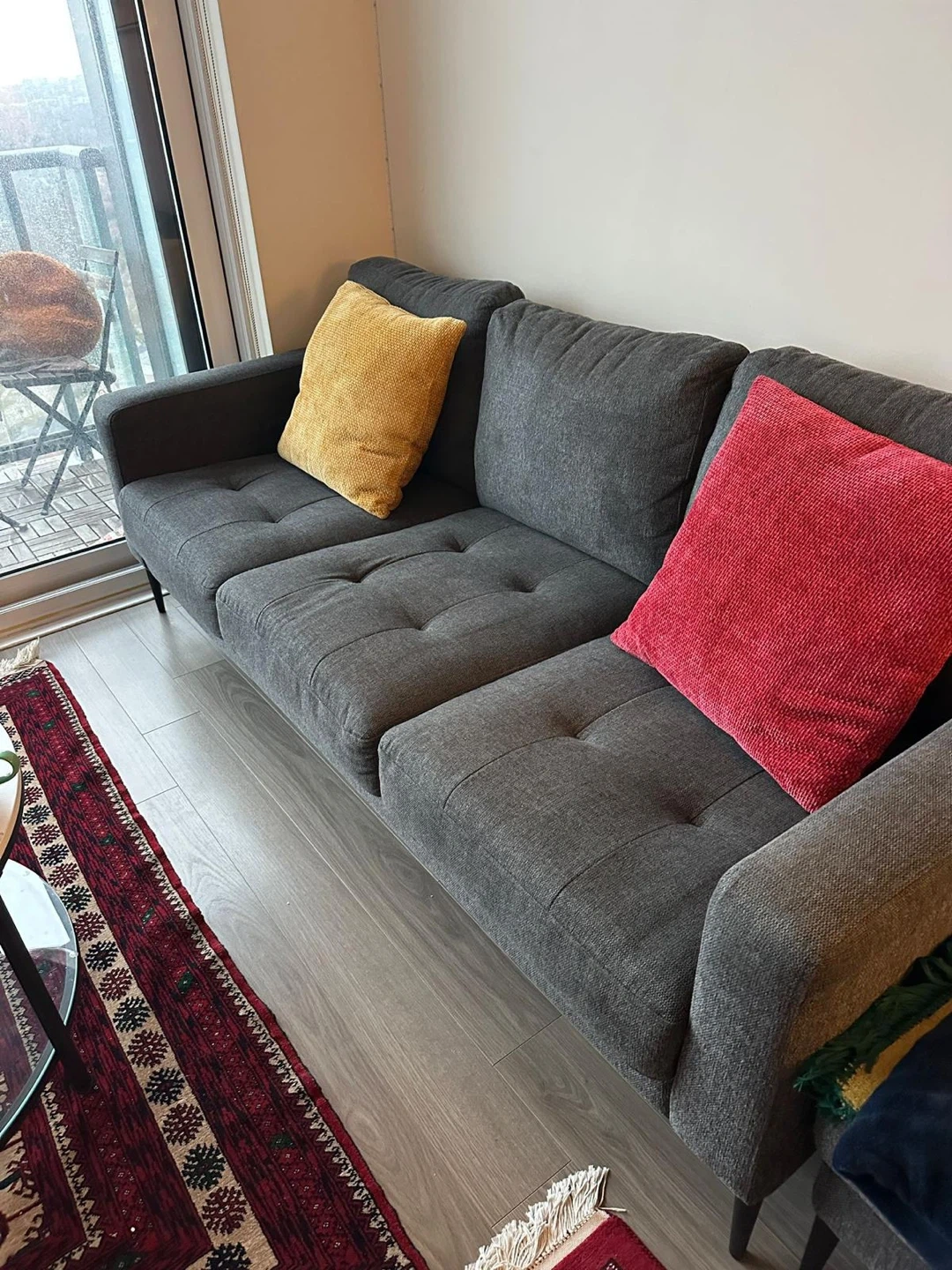 A dark grey three-seater sofa with button tufting on the seat cushions. It's upholstered in a durable fabric and sits on short, dark legs. This sofa's neutral colour makes it easy to fit into most living room décors. The minimalist design offers clean lines.