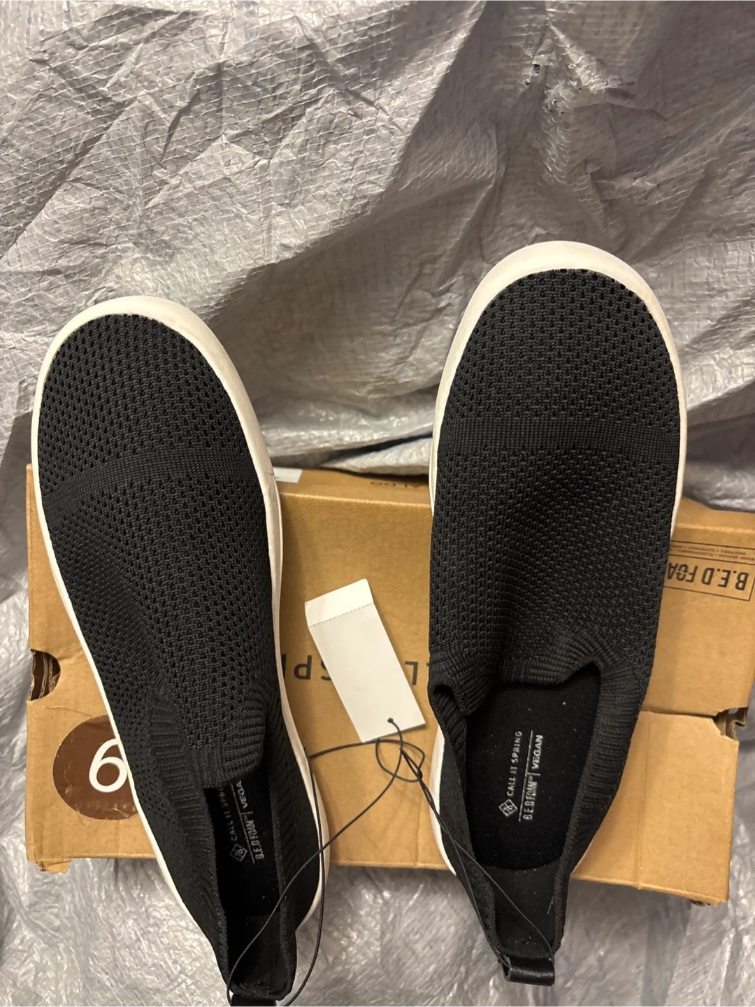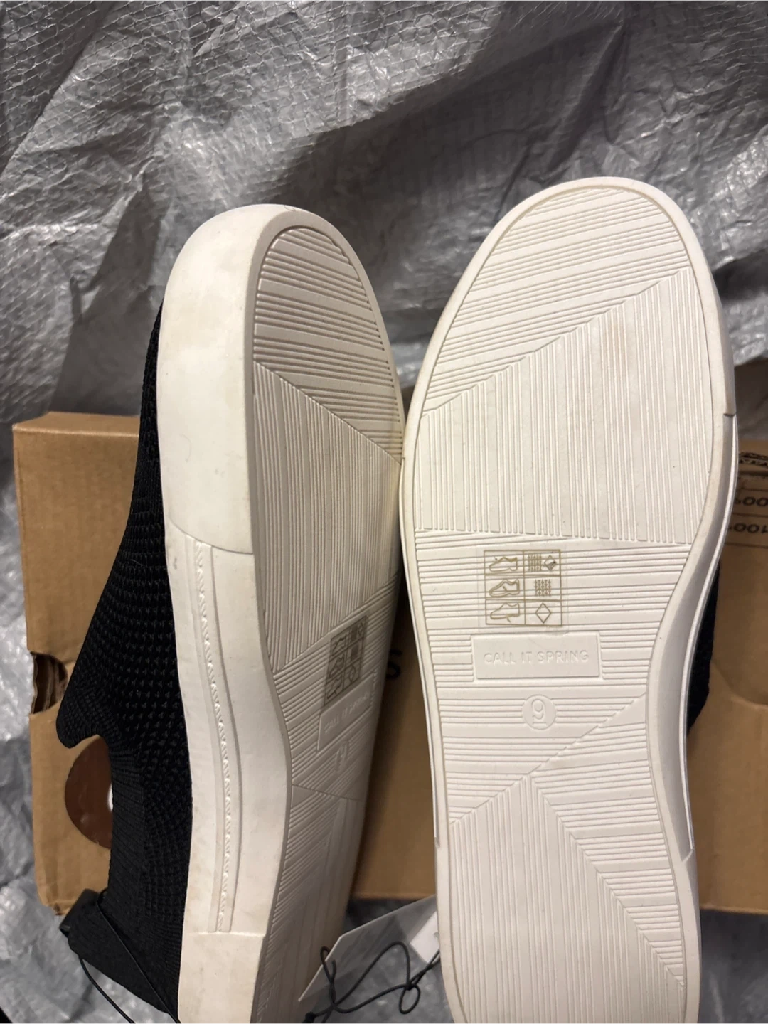 Black slip-on sneakers from Call It Spring. These are a size 9. They're made with a breathable knit upper and a flexible sole. Includes original box.