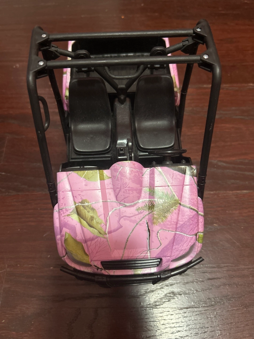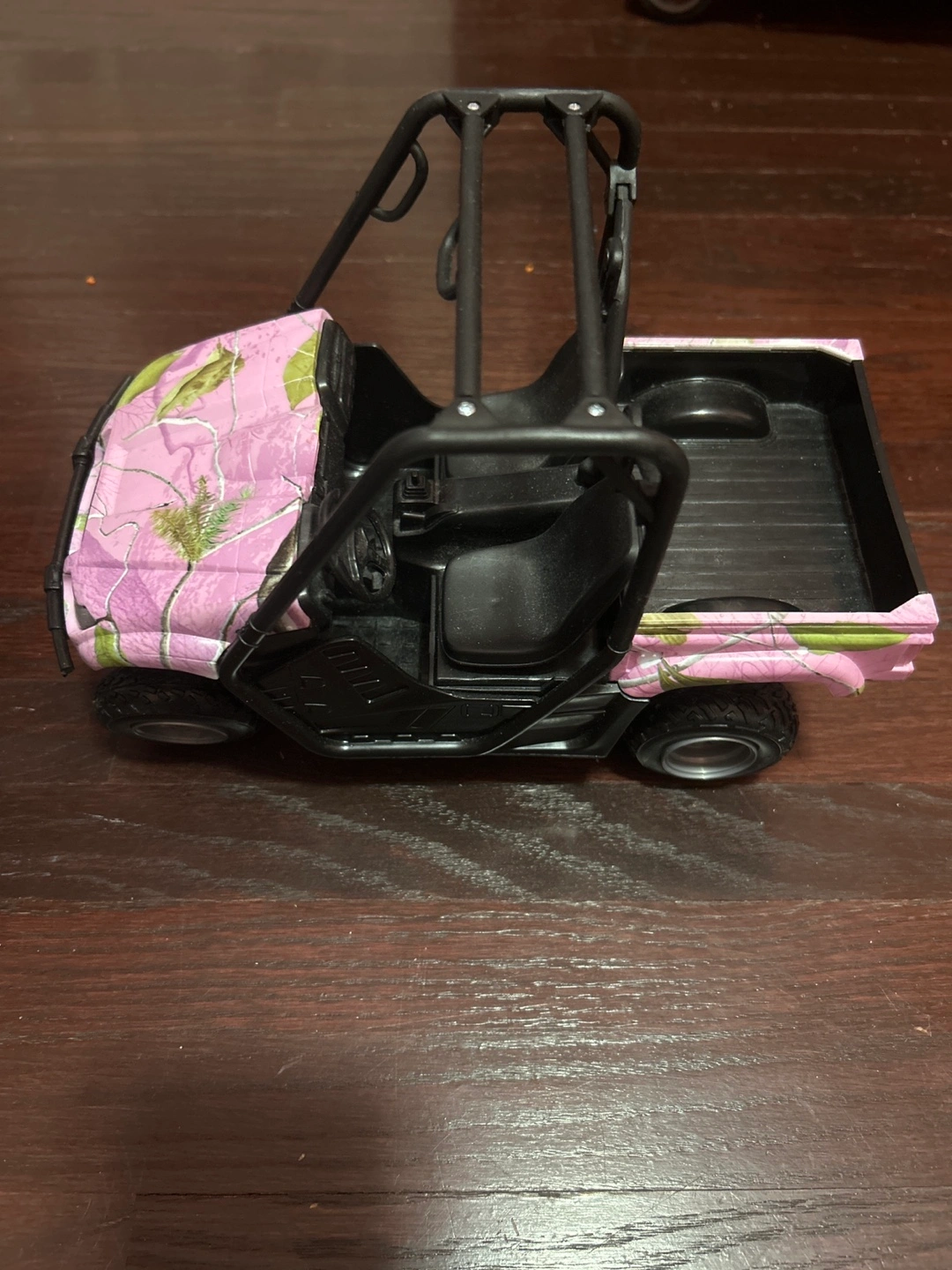 Toy ATV with pink camo design. Has a black frame, two seats, a steering wheel, and a bed in the back.