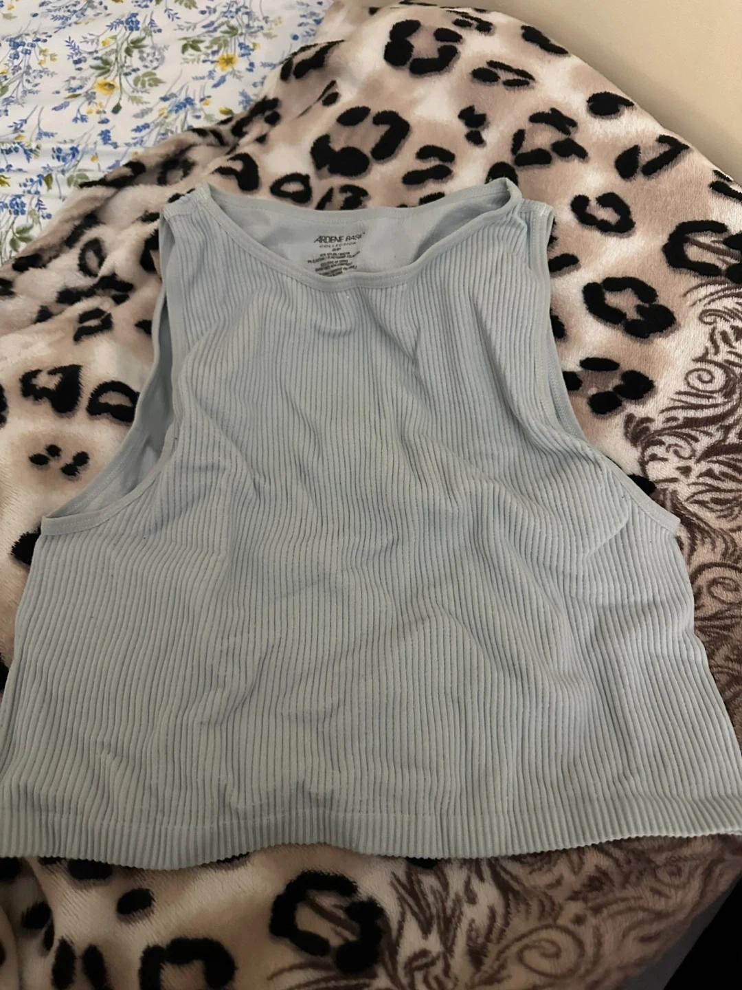 A light blue ribbed tank top from Ardene Basic. It's a sleeveless V-neck style. Great for layering or wearing on its own during warmer weather!