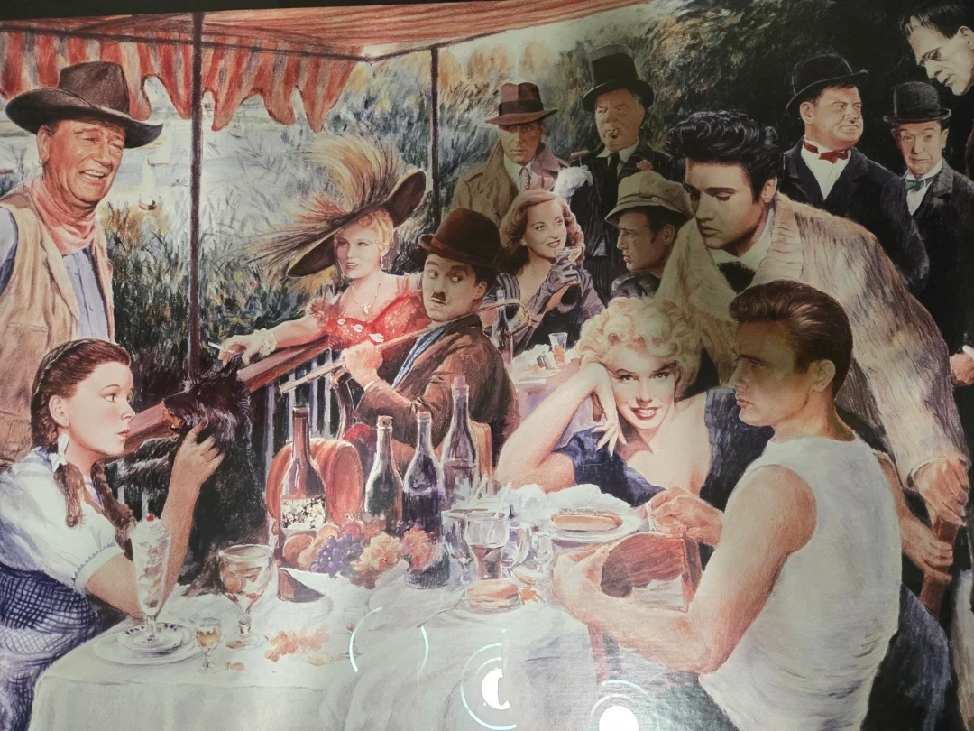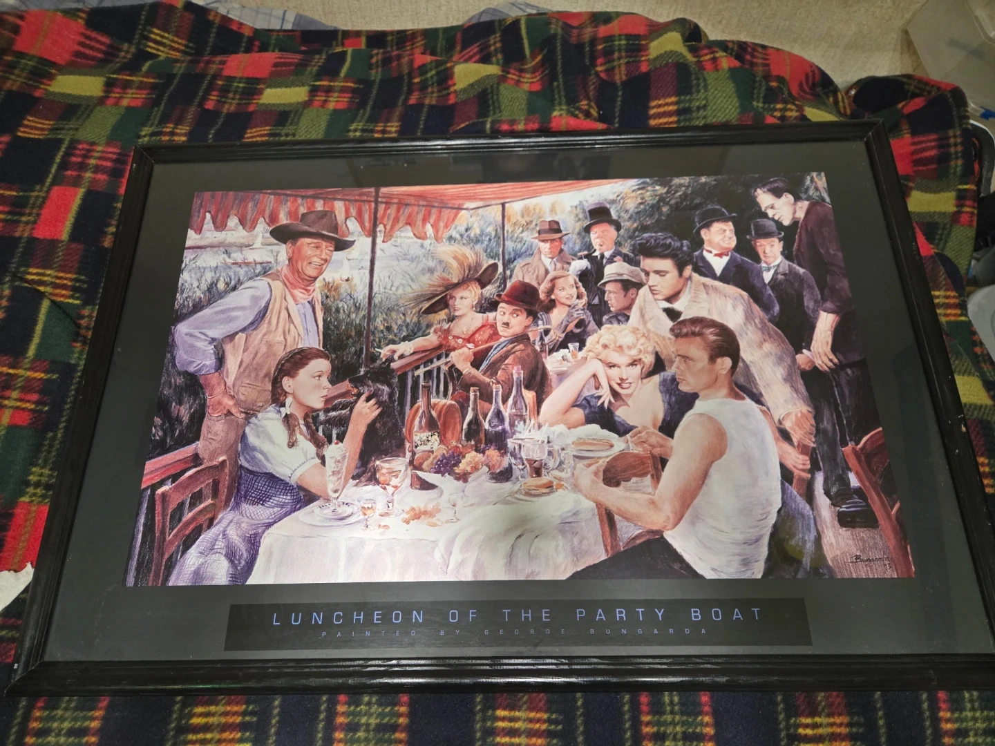 This framed art print features 'Luncheon of the Party Boat' painted by George Sundan. It depicts a gathering of iconic movie stars enjoying a meal together. The print is in a black frame, ready to hang.