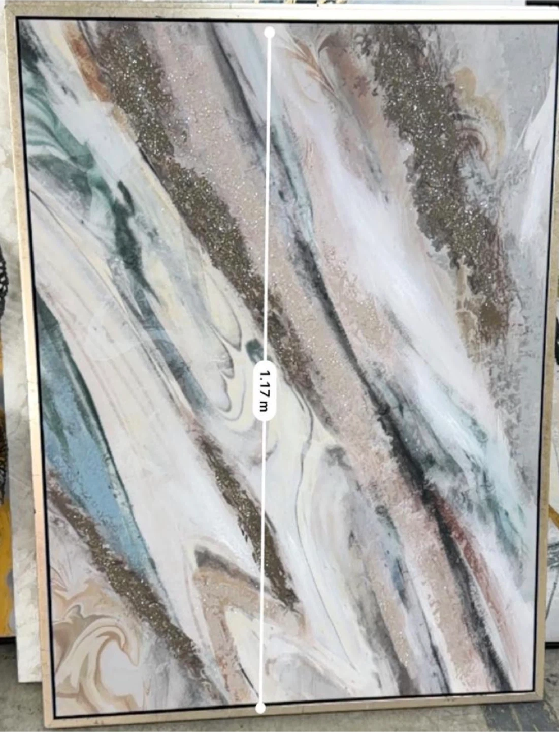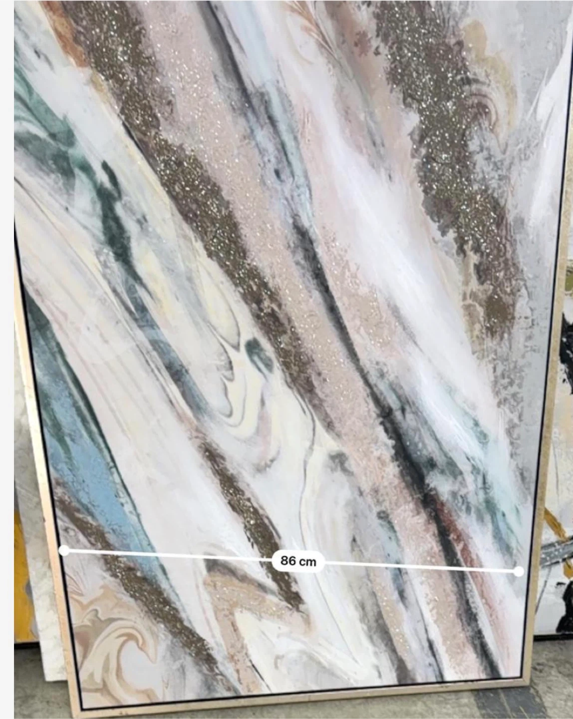 This abstract wall art features a striking marbled design with glitter accents. It measures 86 cm wide and 1.17 m tall. The neutral colour palette makes it a versatile addition to any room.