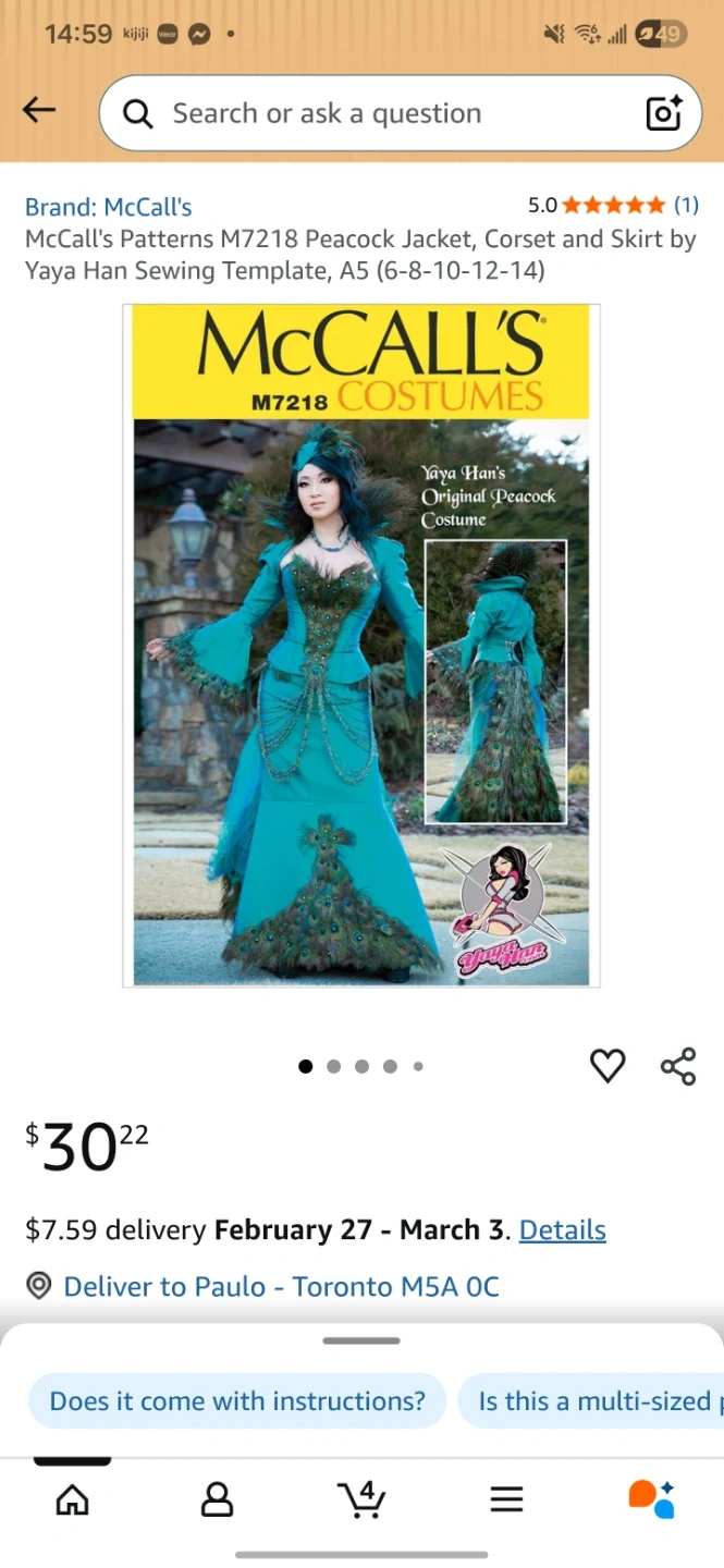 A collection of McCall's sewing patterns for various garments. Includes costume patterns like the "Yaya Han Original Peacock Costume" and dresses. Also features patterns for children's tops, shorts, and pants. Sizes vary from A5 to ZZ.
