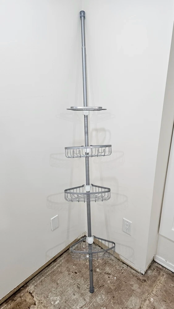 Here's a tension corner shower caddy! It's perfect for organizing your shower essentials in a small space. It has multiple shelves to hold shampoo, conditioner, soap, and more. It's in great condition and ready to use in your bathroom